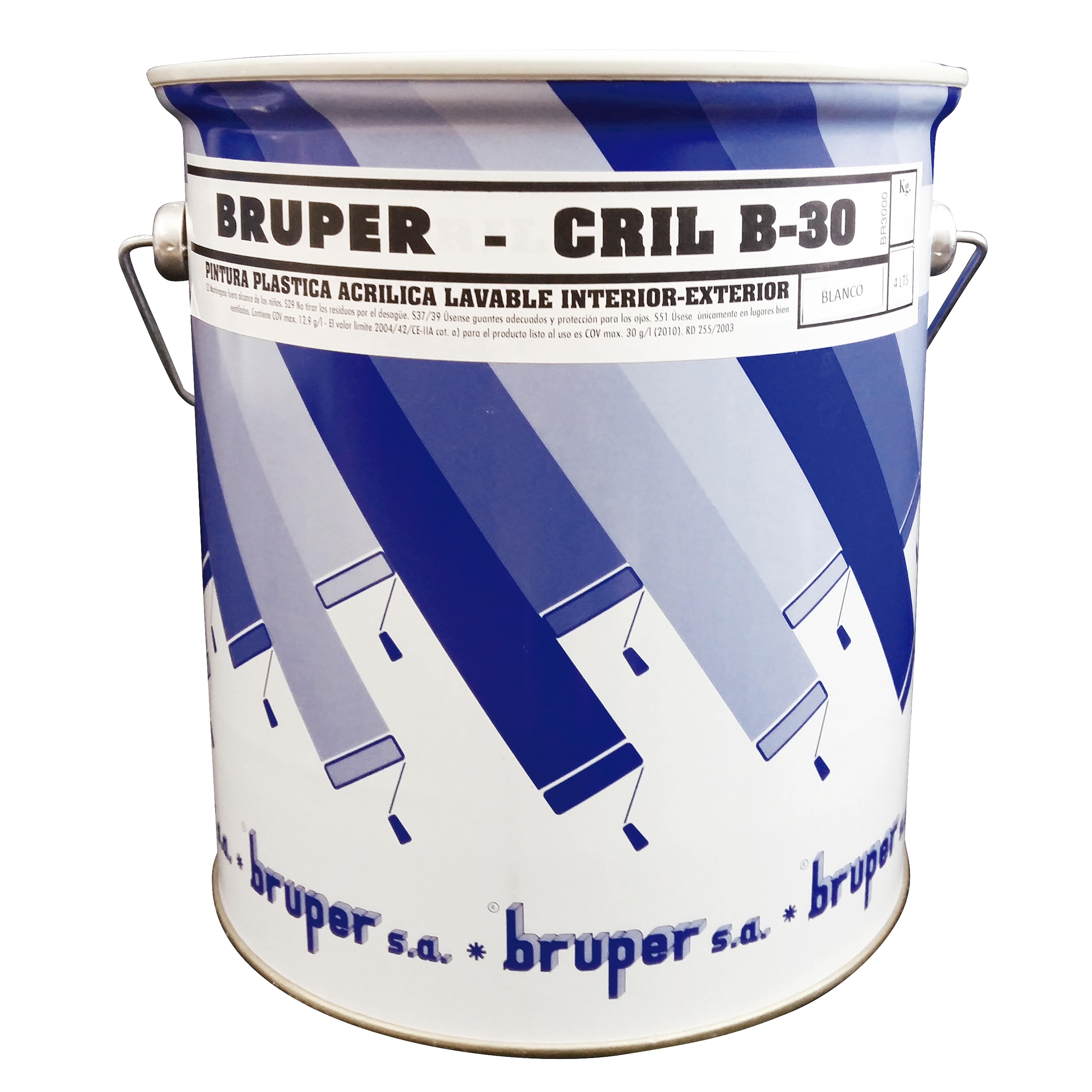 Pintura plástica blanca con acabado mate, de 4 litros B-30. Uso interior y exterior. Rendimiento: 8 a 10m2/kg. Para el pintado de todo tipo de superficies de albañilería, madera y metal convenientemente preparadas.