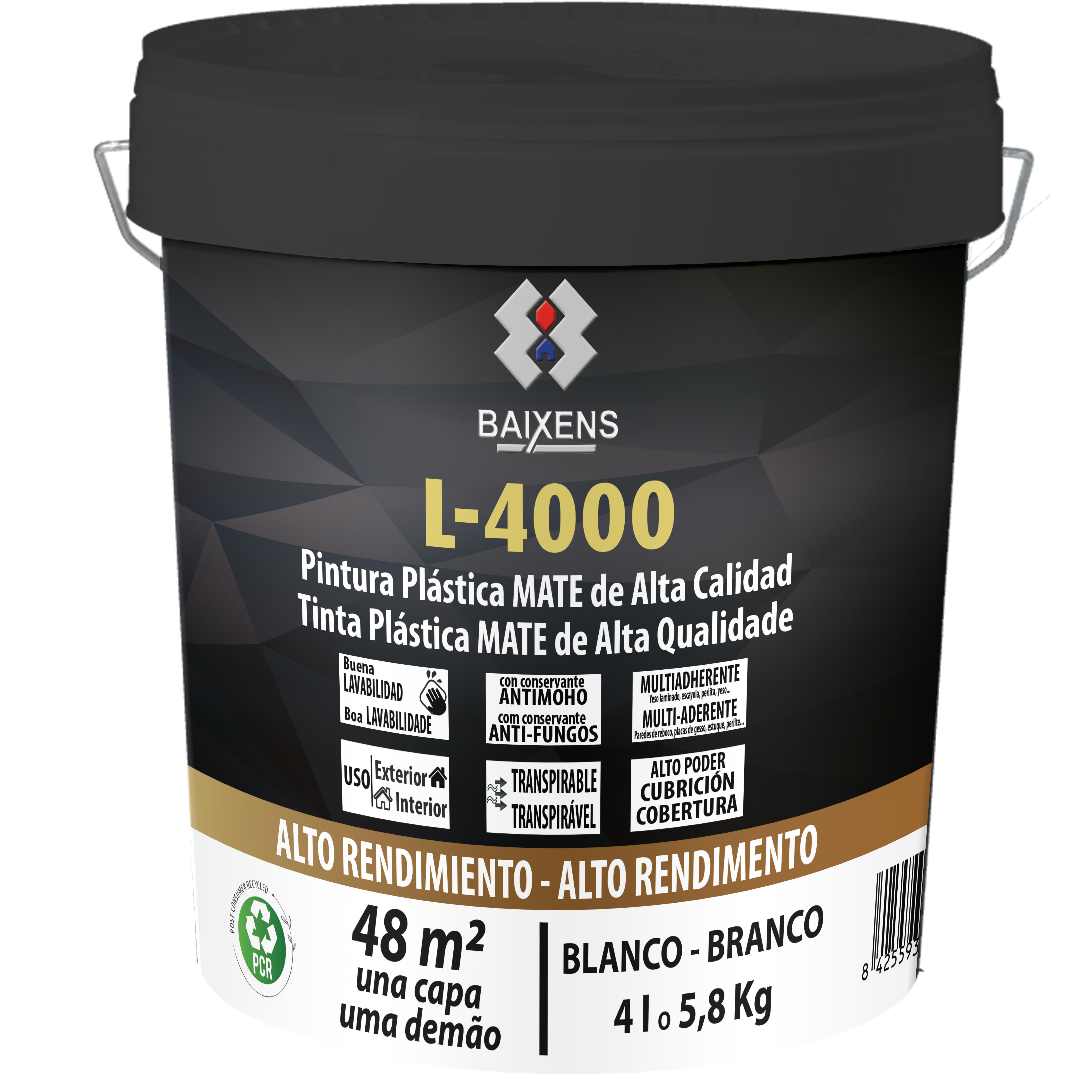 Pintura plástica blanca con acabado mate, de 4l L4000. Uso interior y exterior. Rendimiento: 12-17m2/l. Indicada para el pintado de paredes, techos, fachadas, soportes de yeso y albañilería en general.