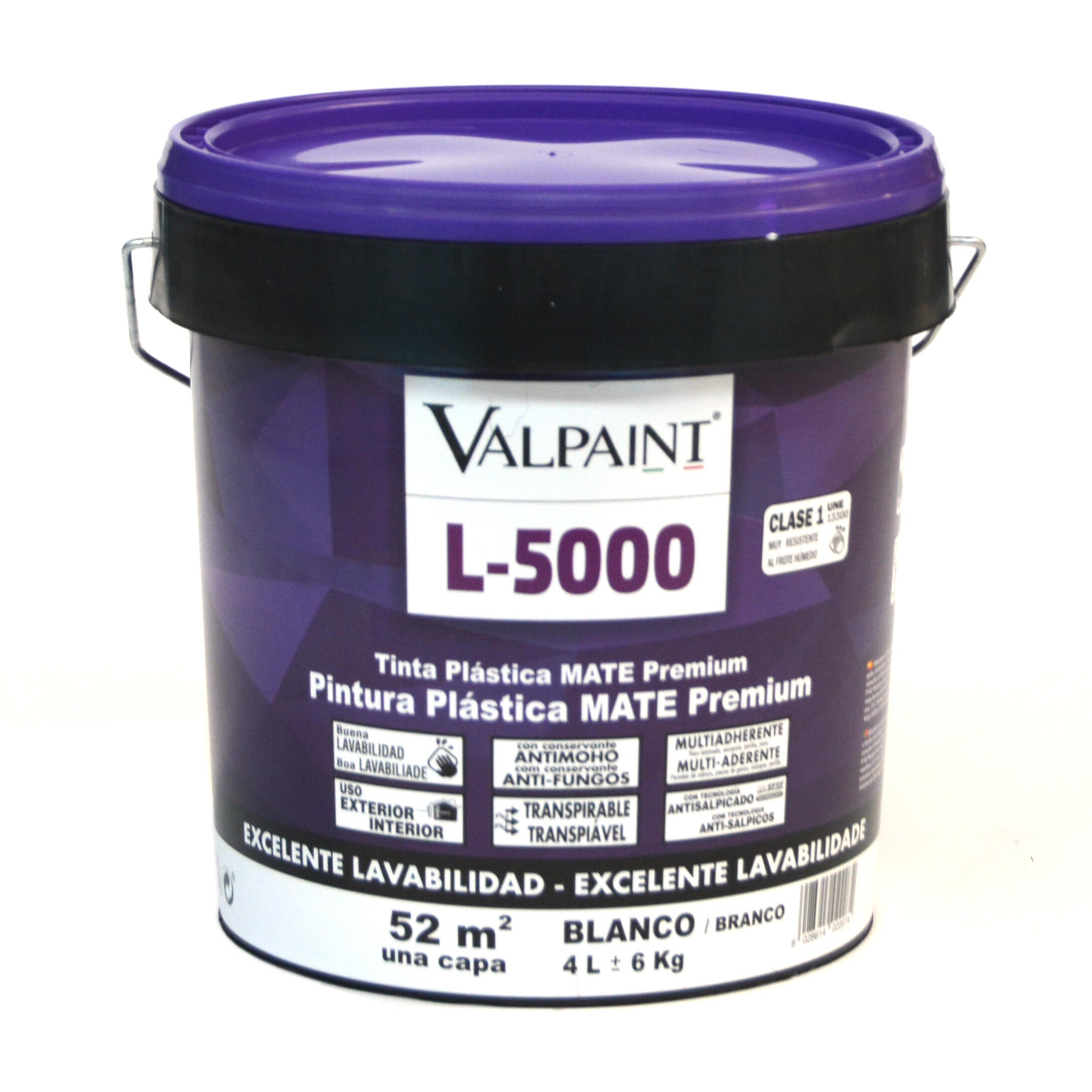 Pintura plástica blanca con acabado mate, de 4l L5000. Uso interior y exterior. Rendimiento: 9-10m2/l. Indicada para el pintado de paredes, techos, fachadas, soportes de yeso y albañilería en general.