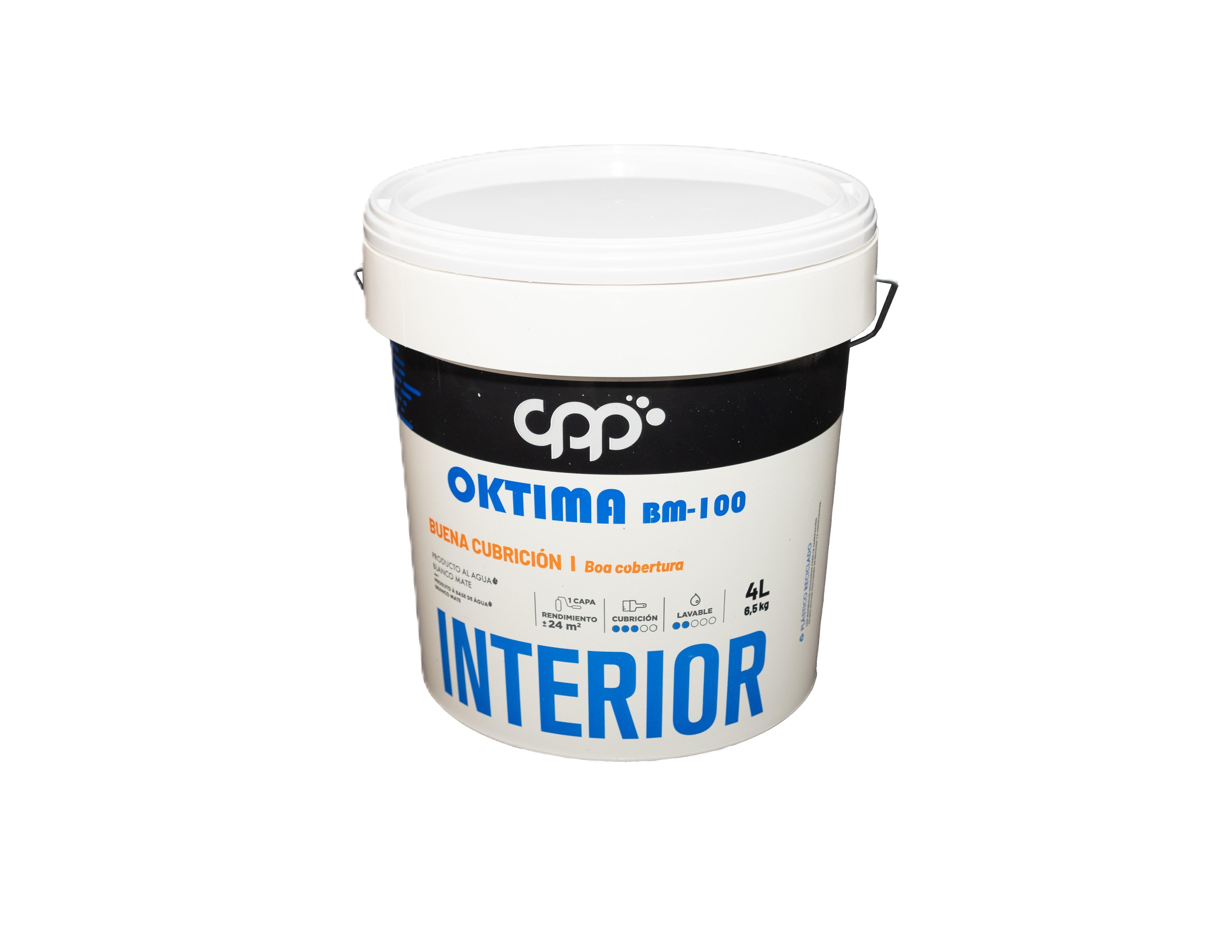 Pintura plástica blanca con acabado mate, de 4 litros Oktima. Uso interior. Rendimiento: 5-7m2/l. Para el pintado de paredes, techos y otros materiales de construcción.