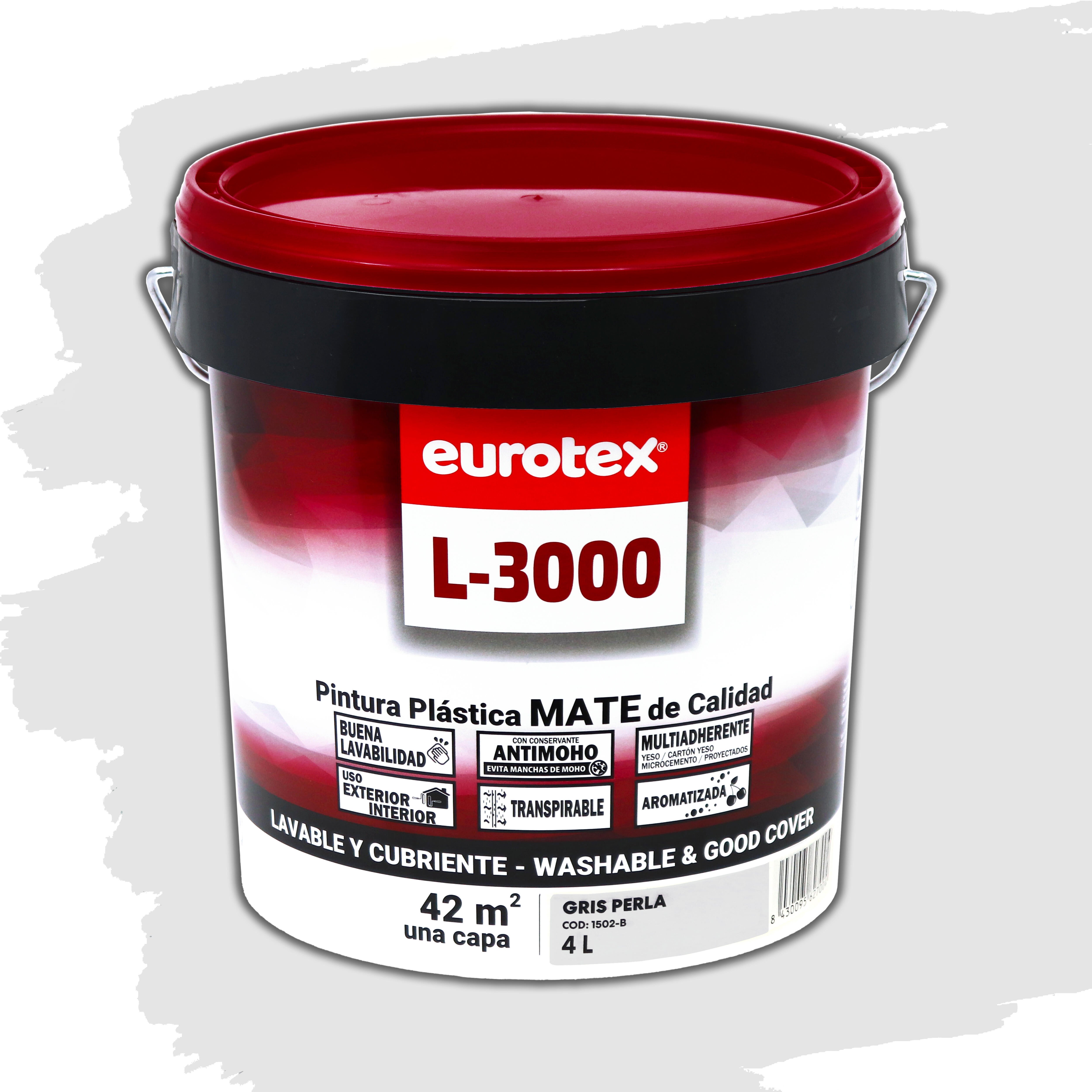 Pintura plástica gris perla con acabado mate, de 4 litros L3000. Uso interior y exterior. Rendimiento: 6,5m2/kg. Pintura usada como recubrimiento sobre paramentos horizontales y verticales interiores, puede ser utilizada también al exterior.