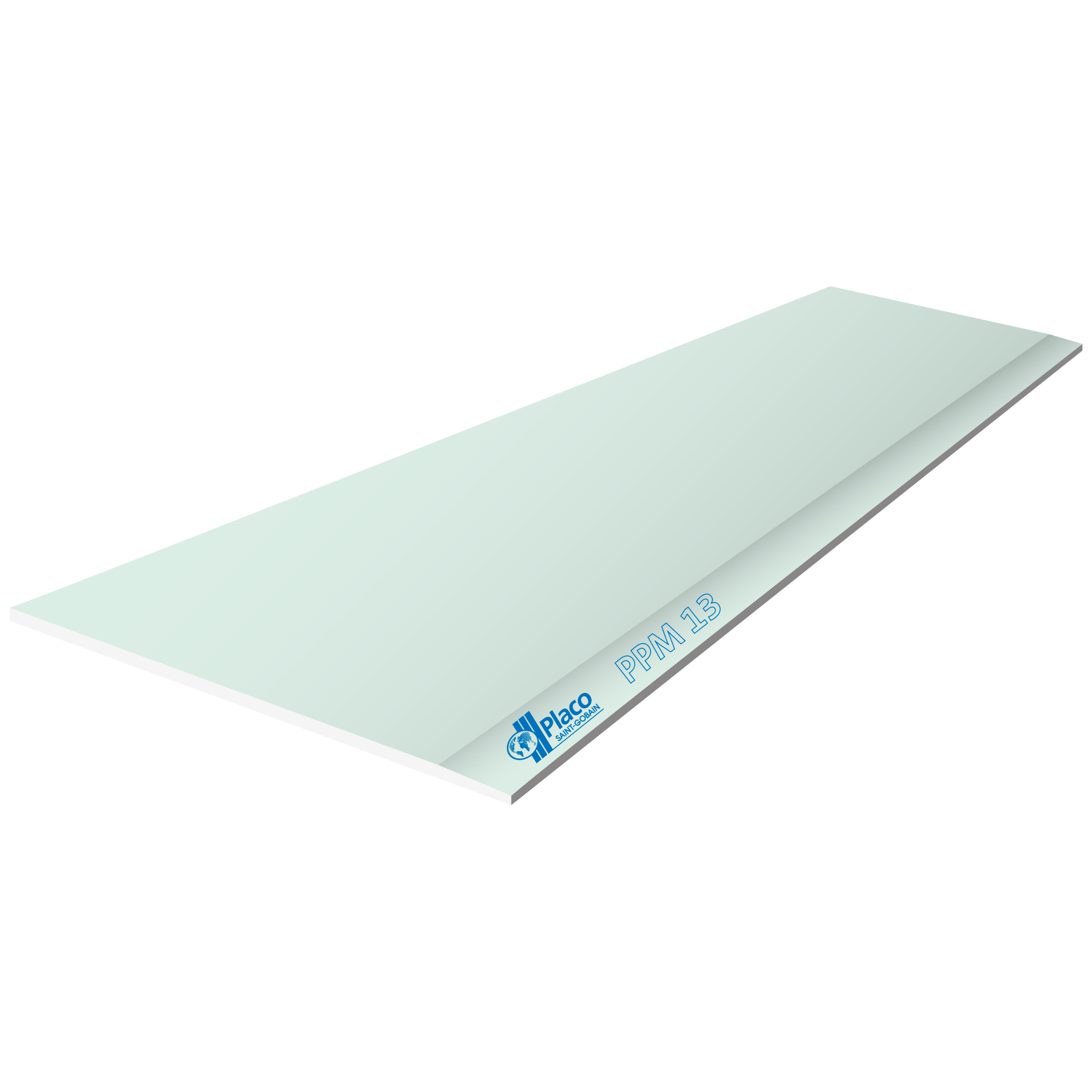 Placa de yeso laminado PPM 3000x1200x13mm destinada a sistemas de obra seca en interiores en zonas húmedas.