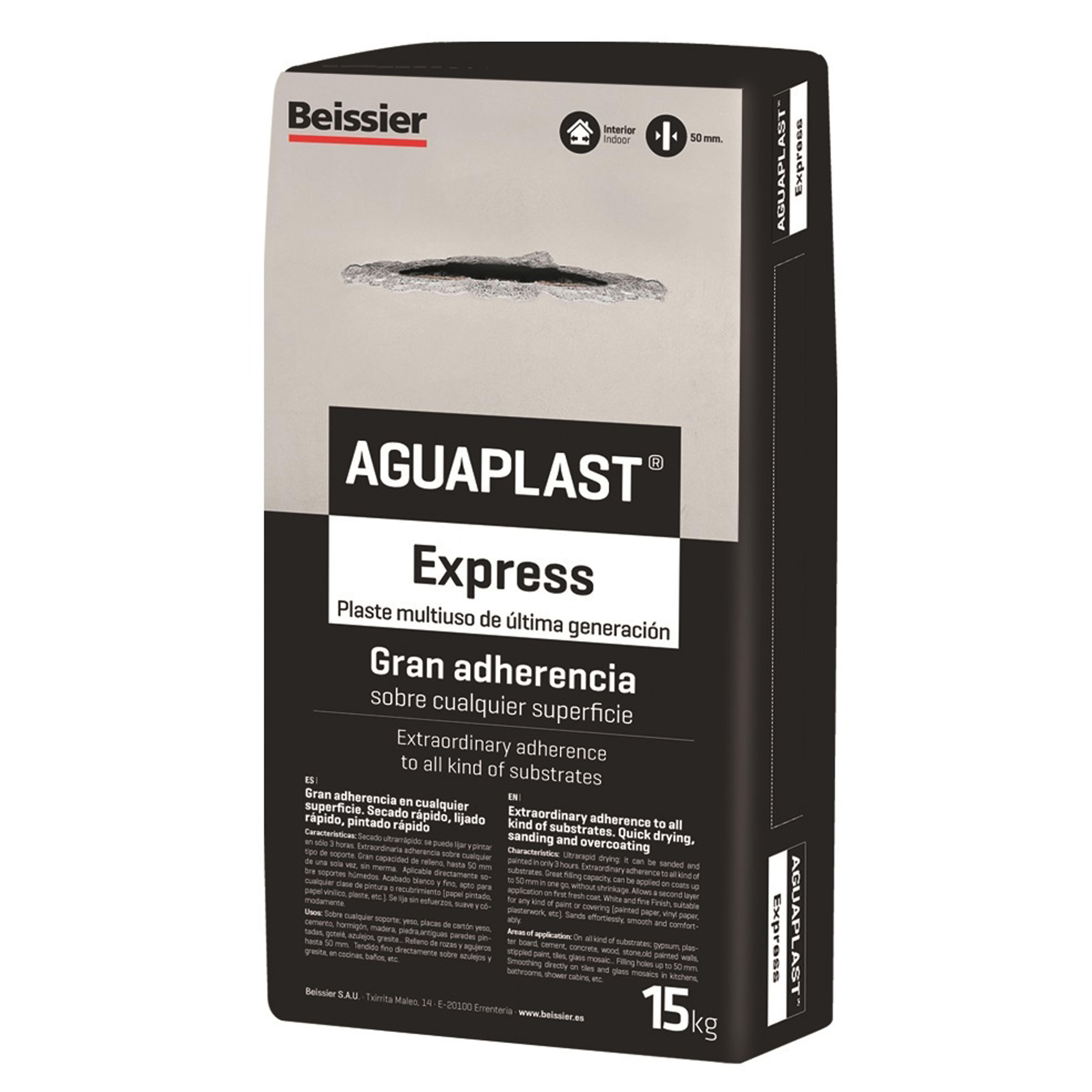 Plaste en polvo capa gruesa 15kg Aguaplast express de la marca Beissier . Destinado a uso interior. Para trabajos polivalentes donde se requiera un secado muy rápido y ganar tiempo. Acabado muy fino, no produce cambios de color.