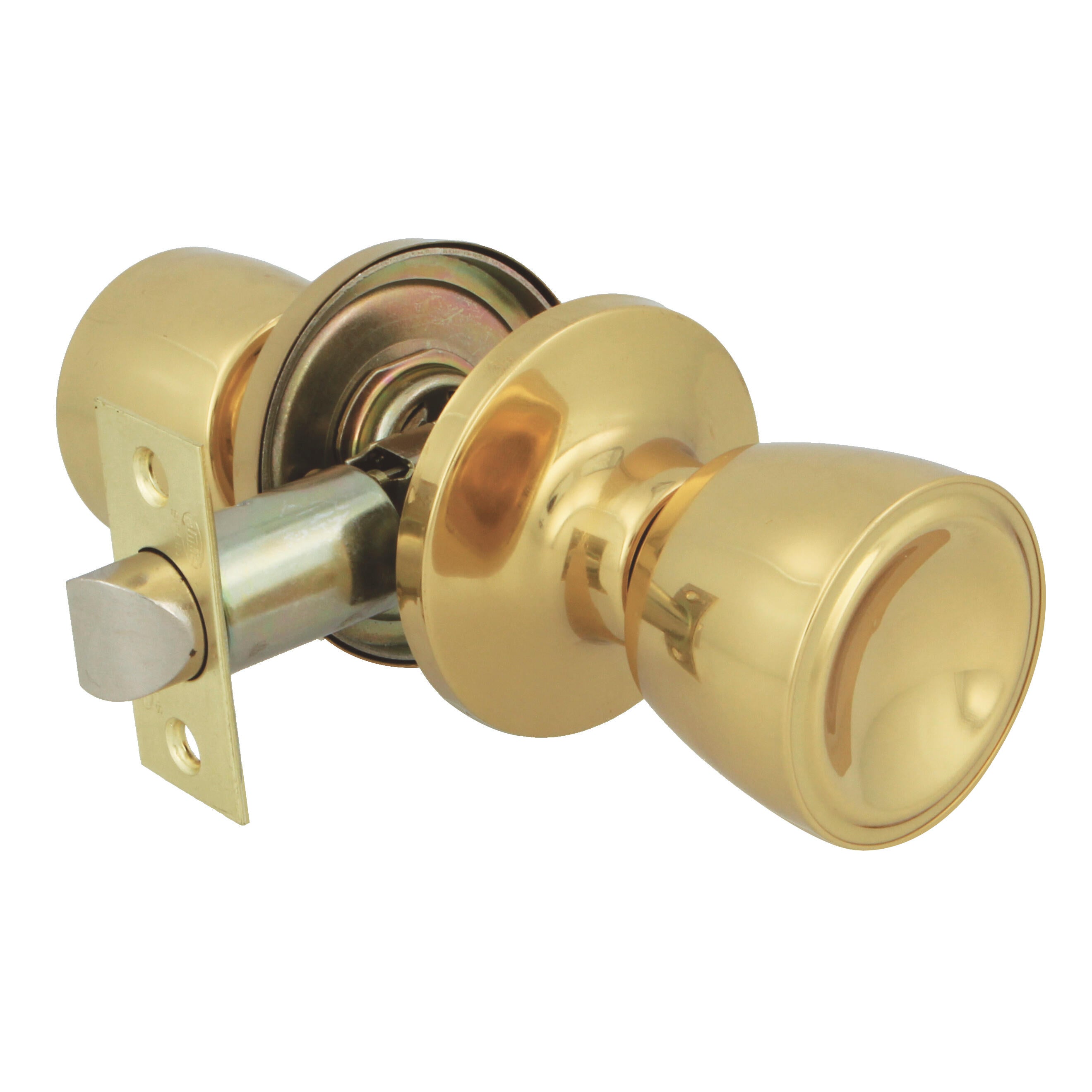Pomo puerta de interior de paso. Picaporte de entrada 60-70 mm. Roseta. Diámetro 65 mm. Acabado latón pulido barniz.