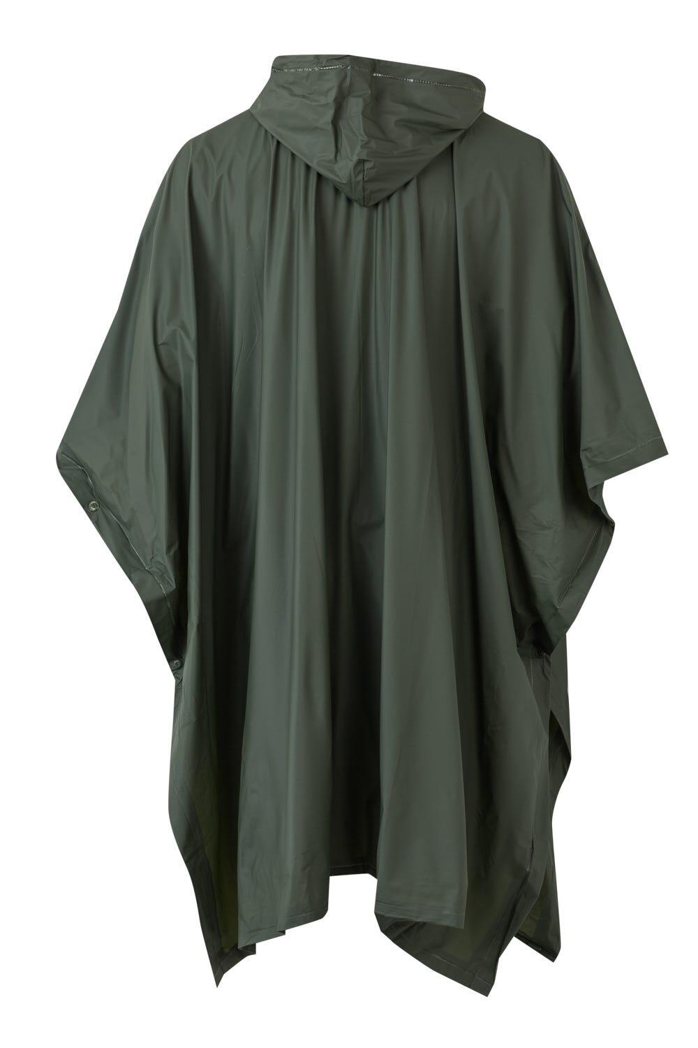 Poncho de lluvia 100/ Poliester, 180 gr/m2. Impermeable. Con capucha. Automático de plástico para cerrar los laterales. Verde. Talla única.