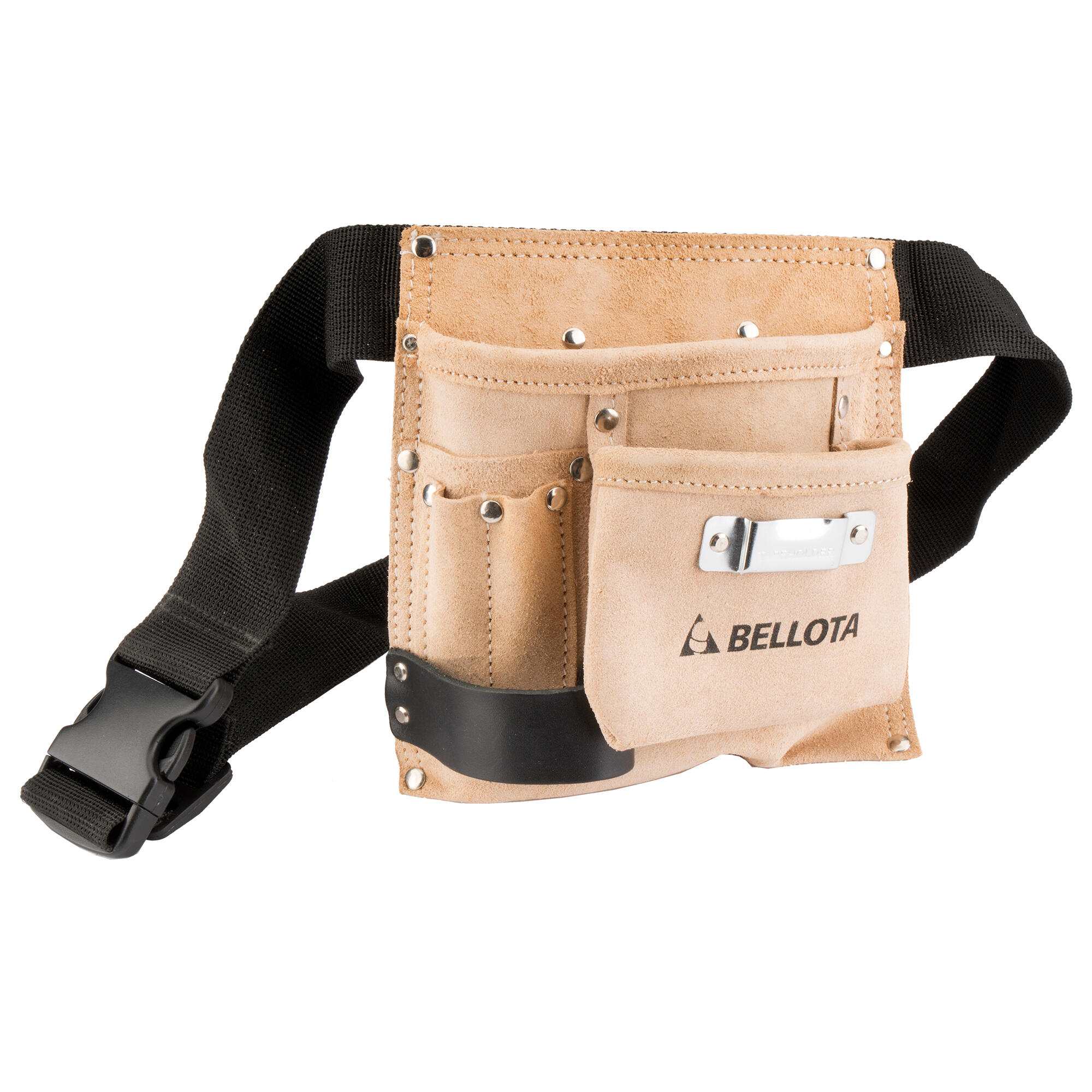 Cinturón porta herramientas de piel de alta calidad, 3 bolsillos, y un alojamiento para el martillo y para el flexómetro. Cintura ajustable. Para trabajadores de la construcción. Color beige y acabado afelpado. Medidas: 22.5x21.5x7cm.