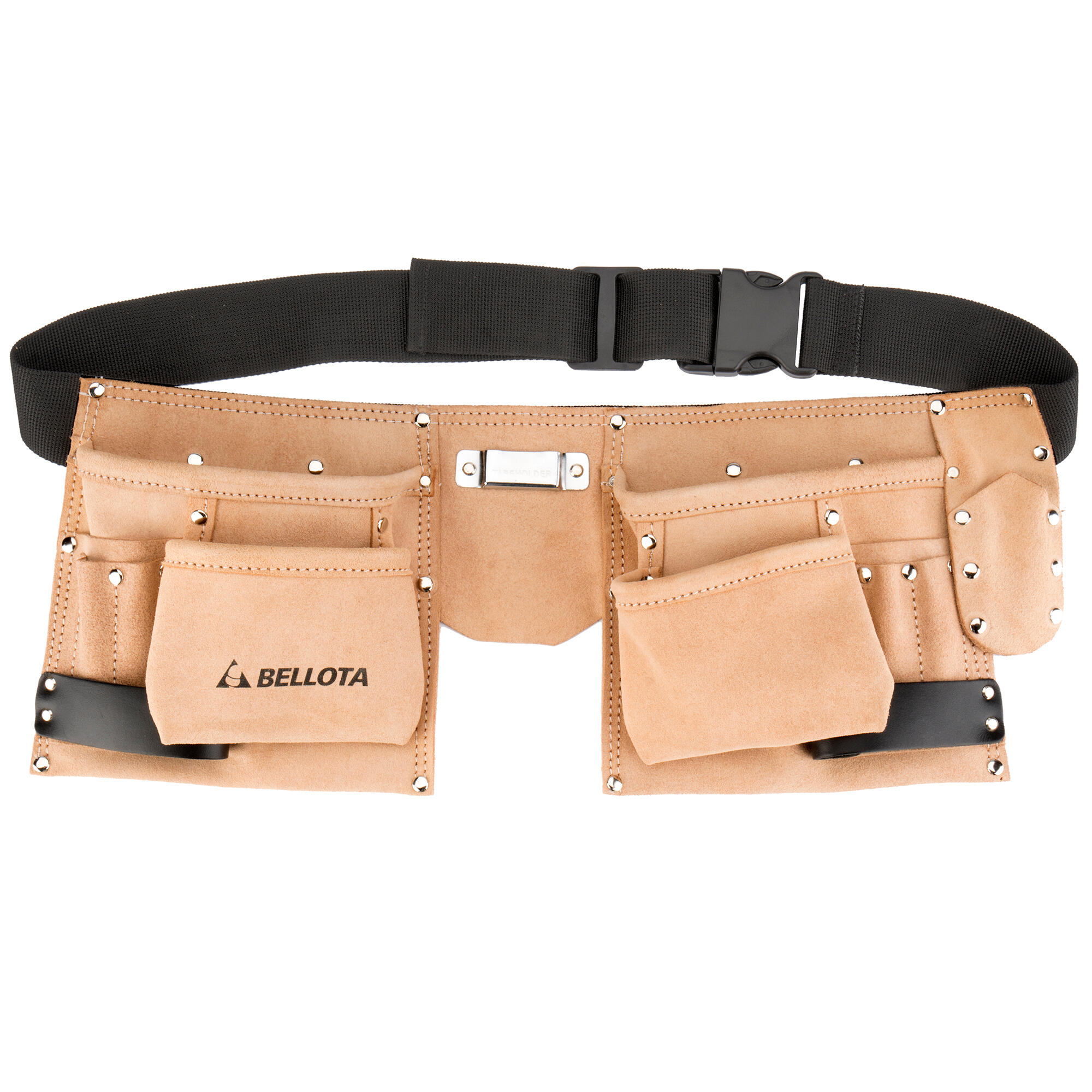 Cinturón porta herramientas doble, fabricado en piel, con 6 bolsillos y alojamiento para martillo. Cintura ajustable. Para trabajadores de la construcción. Color beig y acabado afelpado. Medidas: 55x21.5x7cm.