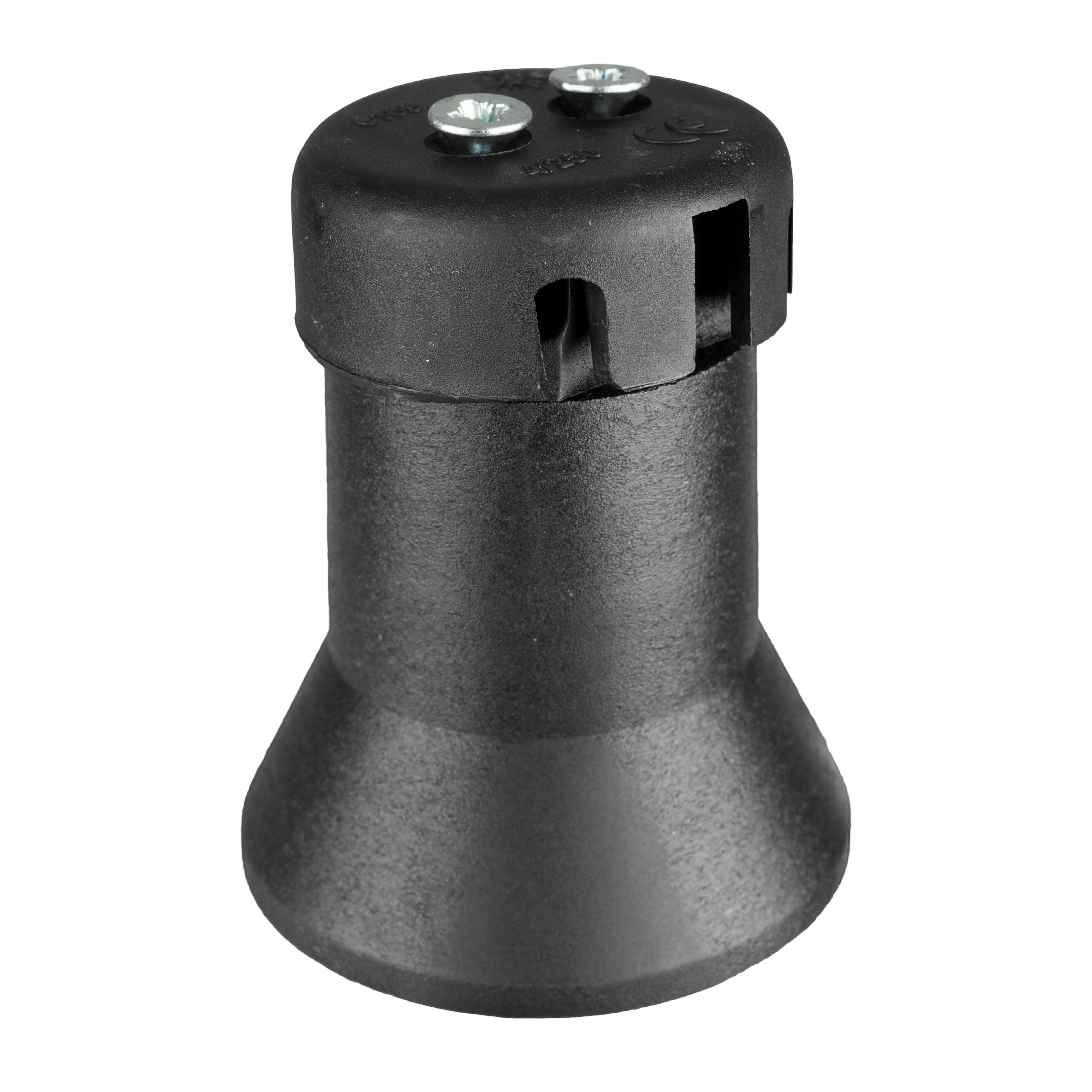 Portalámparas para poner en las ferias, rosca E-27 4A 250V, anclaje por varilla comercial de 5x5, material termoplástico de color negro, potencia máxima 100W.