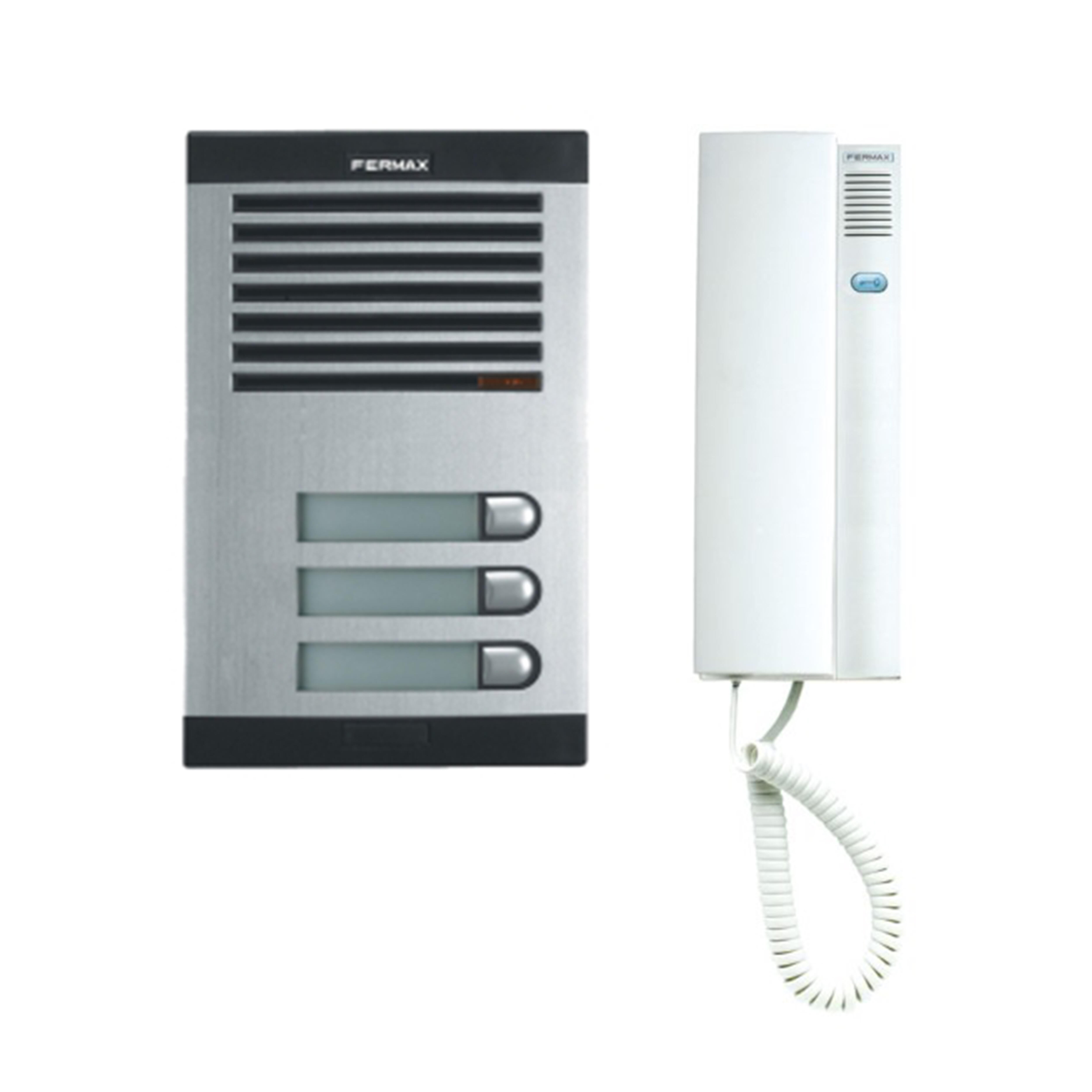 Kit portero audio 5 hilos (4+n) para 3 viviendas fermax. contiene placa exterior, telefono y alimentador