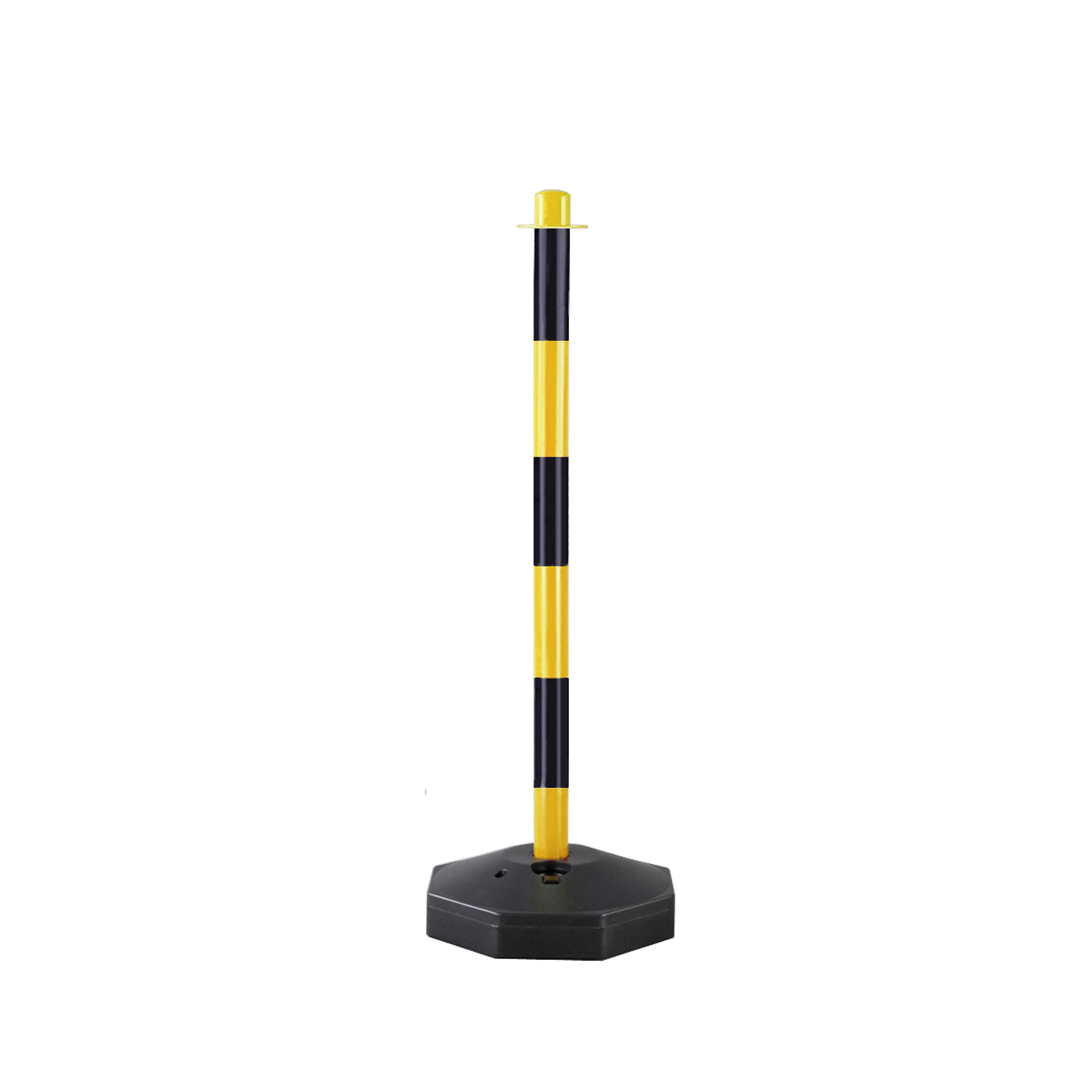 Poste de PVC, fabricado en bandas amarillas y negras. Muy ligero, con soporte plástico para enganche de cadena y base de PVC Rellenable (agua o arena). Ideal para delimitar zonas de seguridad, optimizar espacios de trabajo y organizar y formar filas de personas