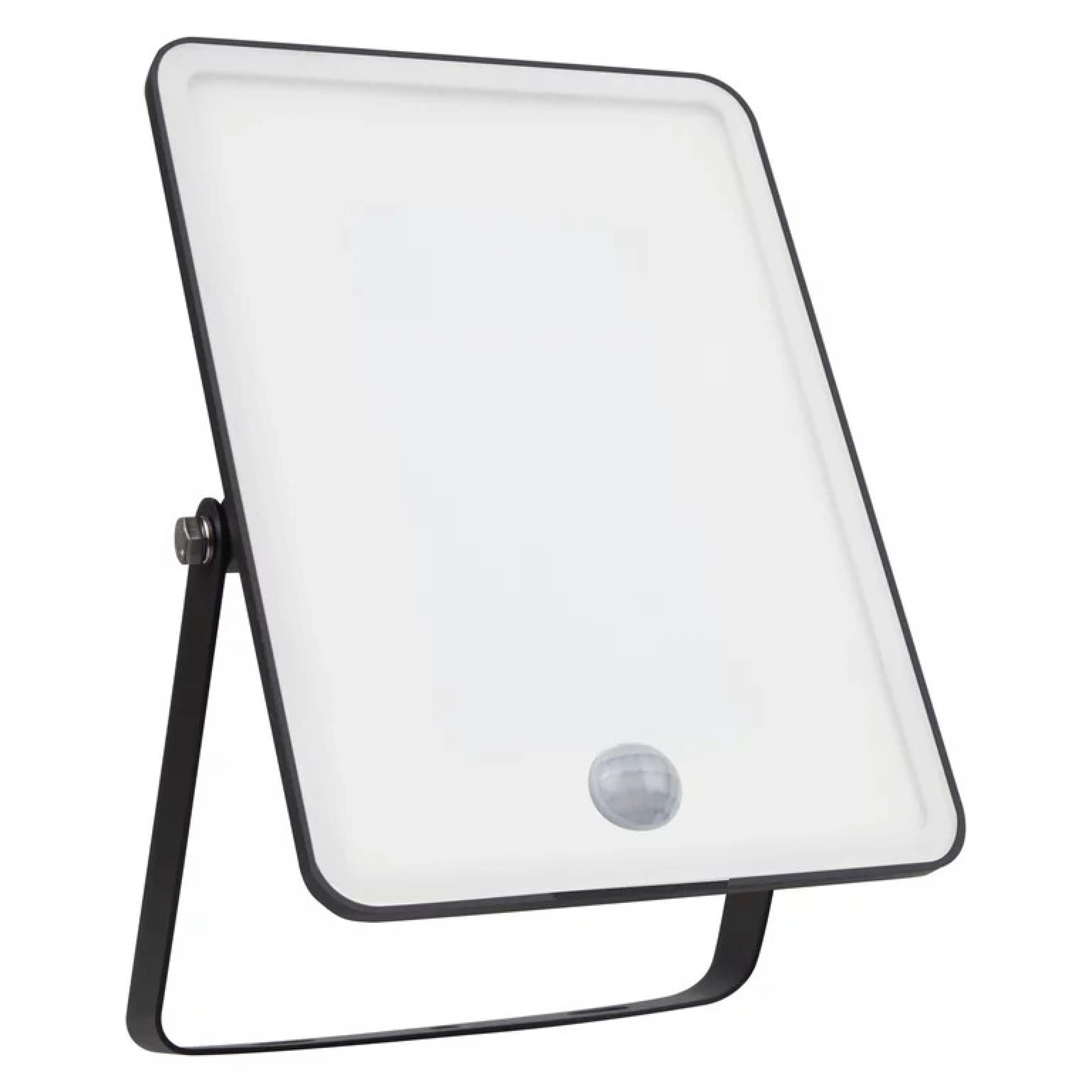 Proyector led con sensor para exterior de 50W de potencia. Luz fría 6000ºK y 4500 lúmenes. Grado de protección IP65 adecuado para su aplicación en exteriores. Difusor blanco saten mate que proporciona una luz homogénea y libre de deslumbramiento. Iluminación basada en la demanda y ahorro de energía gracias al sensor de movimiento y de luz diurna. Ángulo de luz ajustable. Incluye cable de conexión (30cm). Acabado negro. Dimensiones 218x161x34mm
