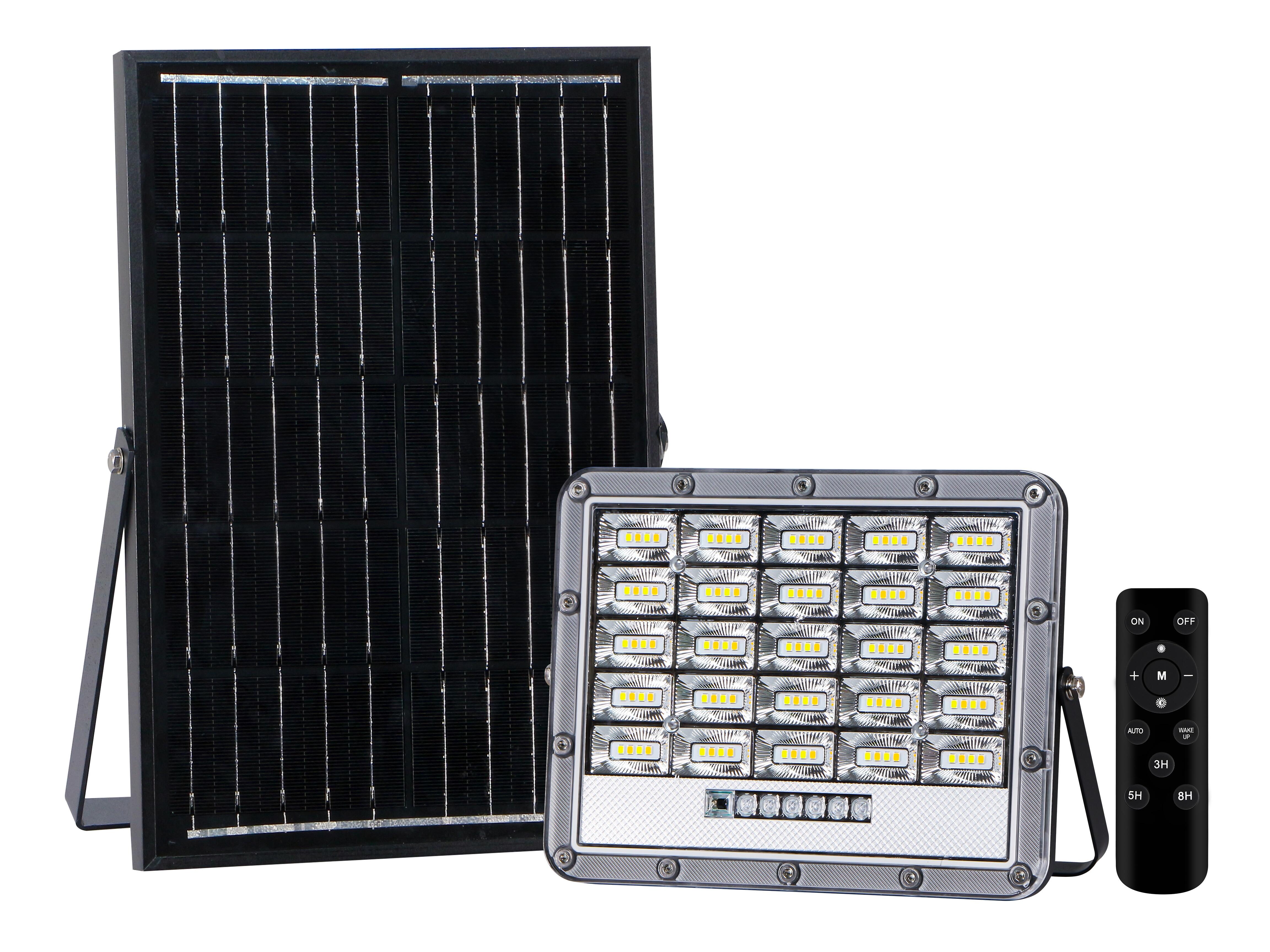 Proyector solar 100W cct. Ideal para iluminación en zonas verdes y jardines, rótulos y pancartas, urbanizaciones, zonas rurales, etc. Rango de detección de 3 a 8 metros 120º. Panel solar independiente de 20w. Brazo basculante 90º en proyector y panel solar. Dos modos de trabajo: automático con sensor y manual (mando a distancia incluido). IP65.