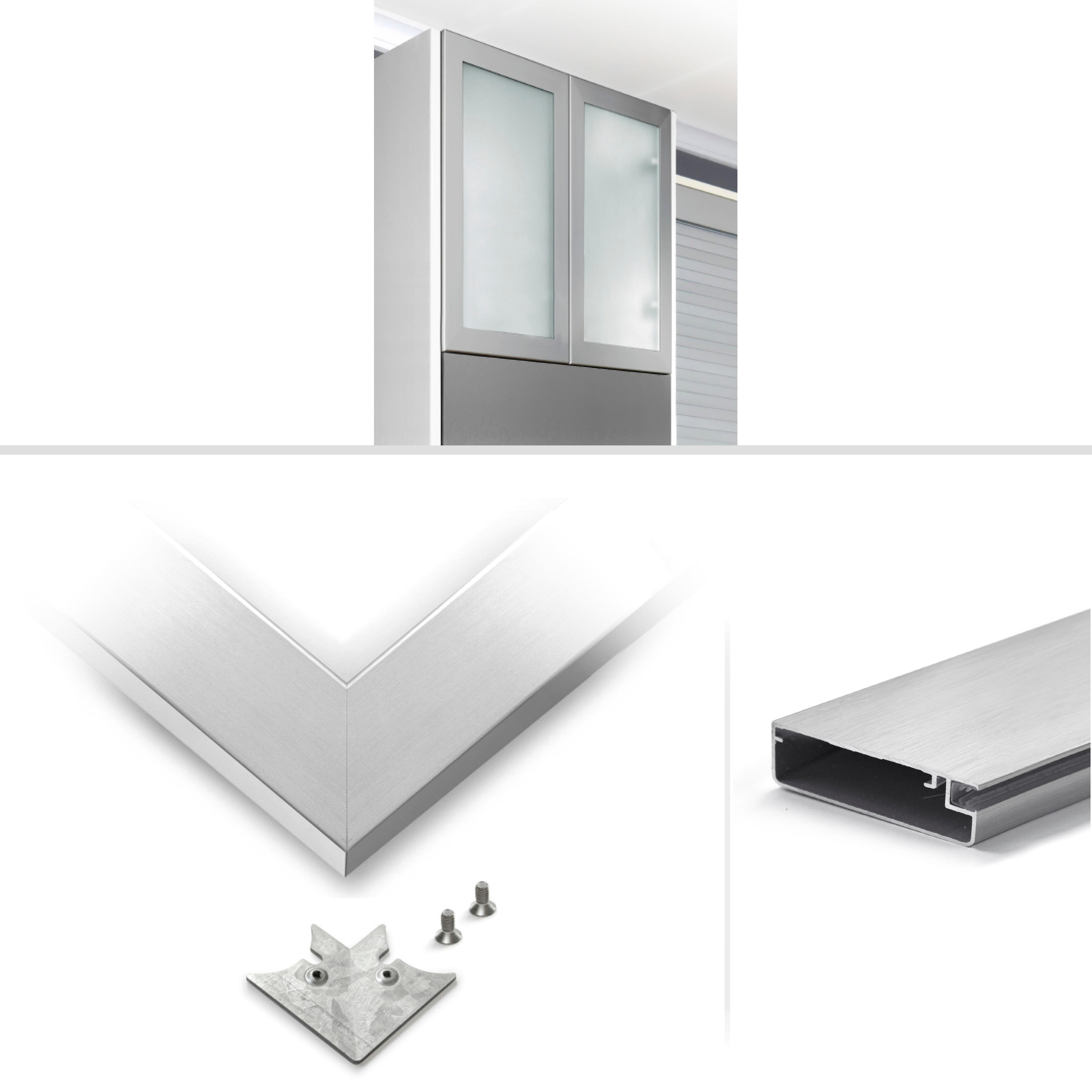 Fabricada con marco de aluminio y cristal monolítico translúcido. Permite ver las siluetas del interior del mueble. Compatible con cualquier acabado de cocina.