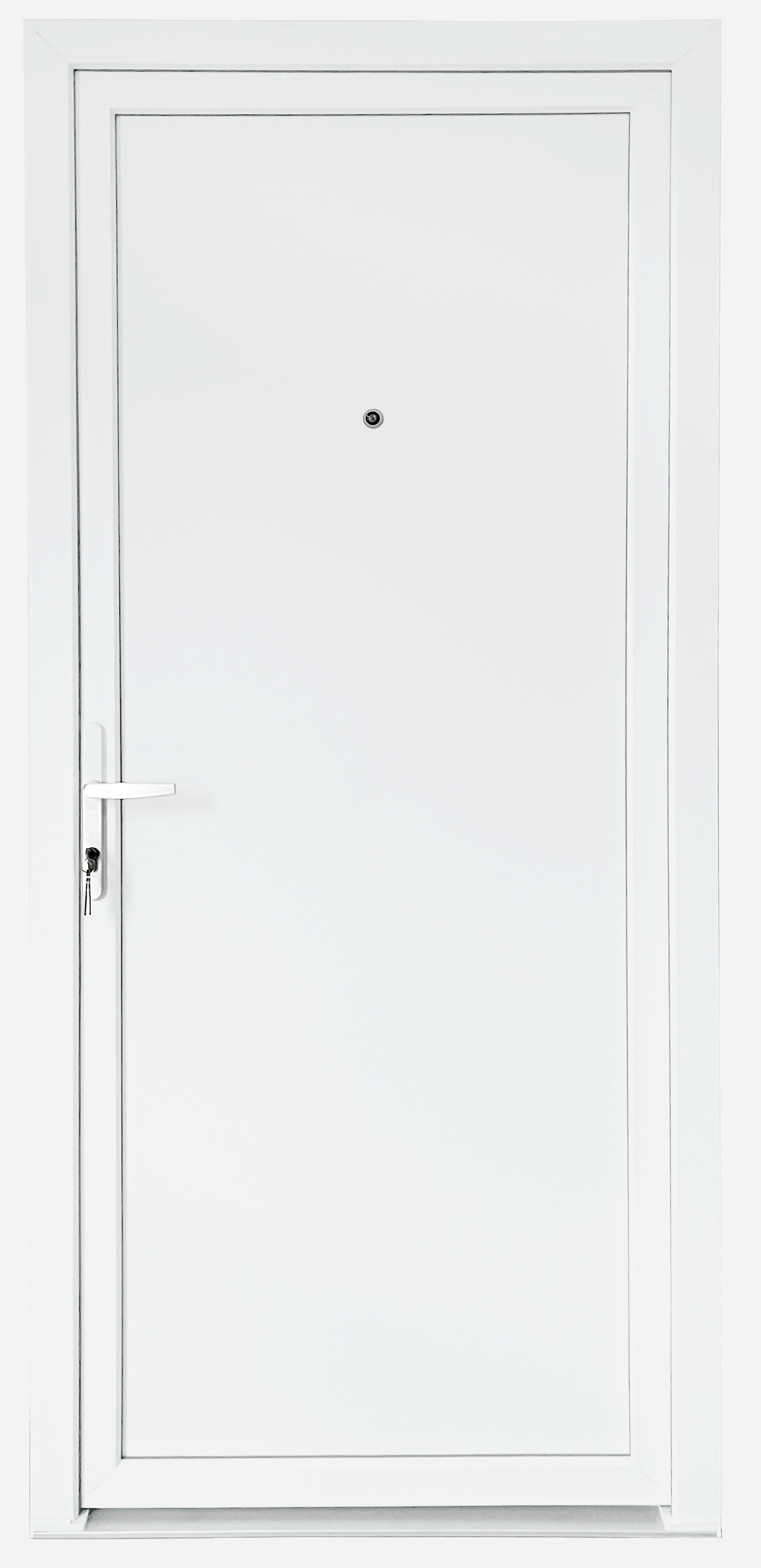 Puerta de entrada fabricada en PVC con acabado en color blanco. Incluye mirilla y manilla para su montaje completo. Elige la puerta de entrada o de servicio adecuada para tu vivienda acorde a todas las medidas de seguridad actuales.