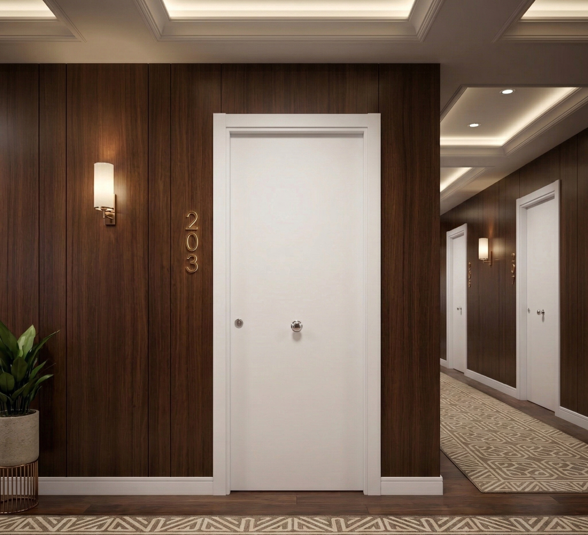 Hoja de 45 mm con núcleo RF30, doble chapa de acero galvanizado y tableros MDF de 5mm.