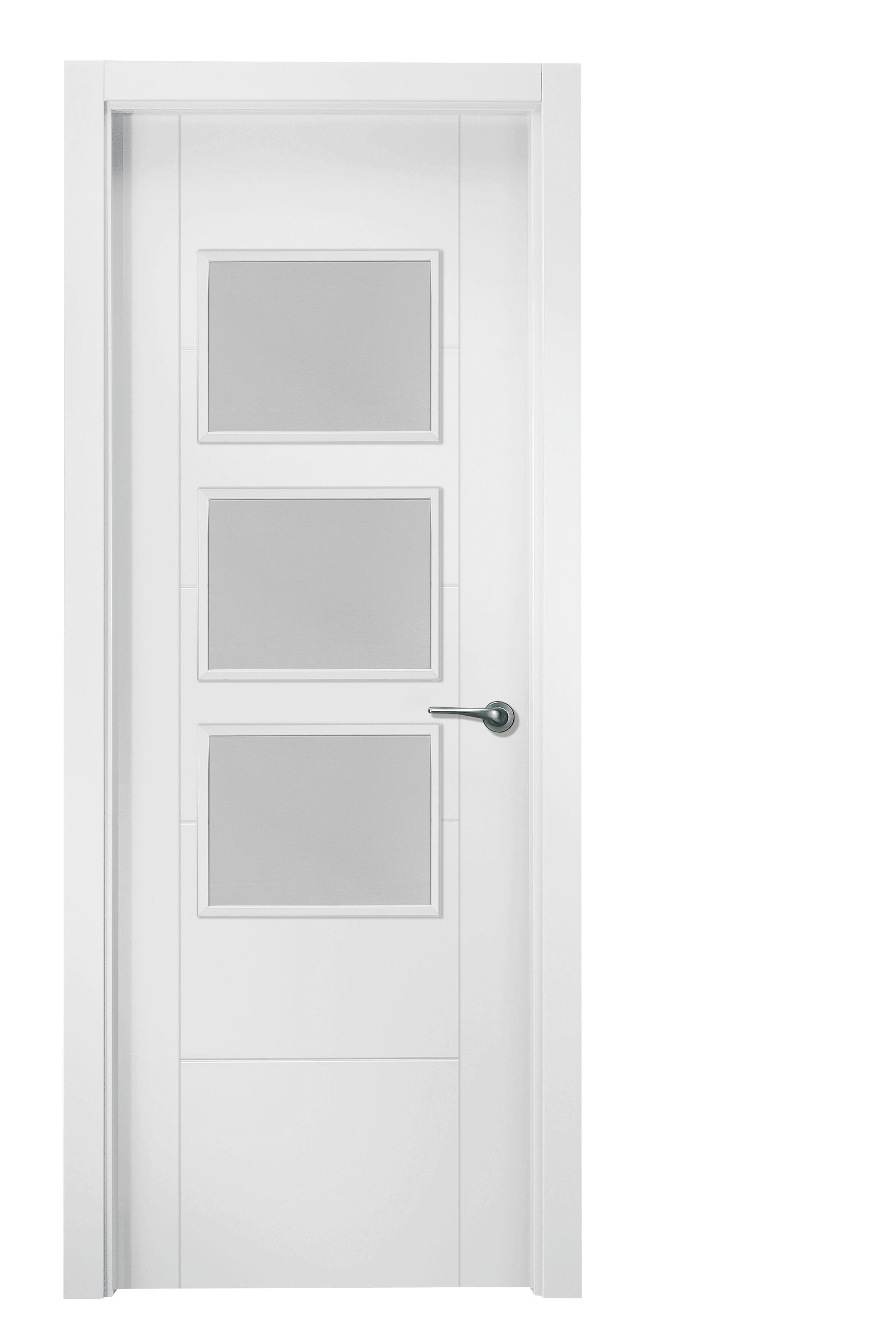 Montada en block sobre premarco extensible. Hoja lacada blanca de 203 x 82.5 cm. Hoja maciza. Laca: 180 g/m2.