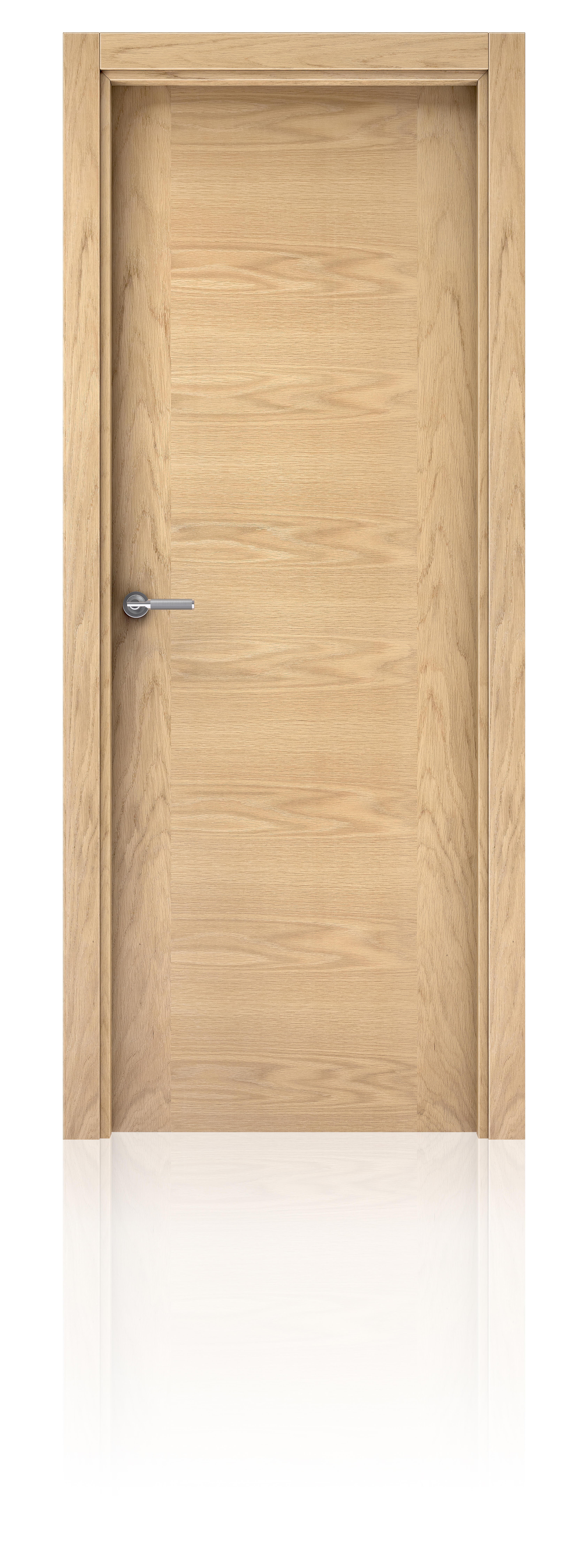 Montada en block sobre premarco extensible. Hoja lisa roble dec de 203 x 62.5 cm. Hoja maciza. Laca 180 h/m2.