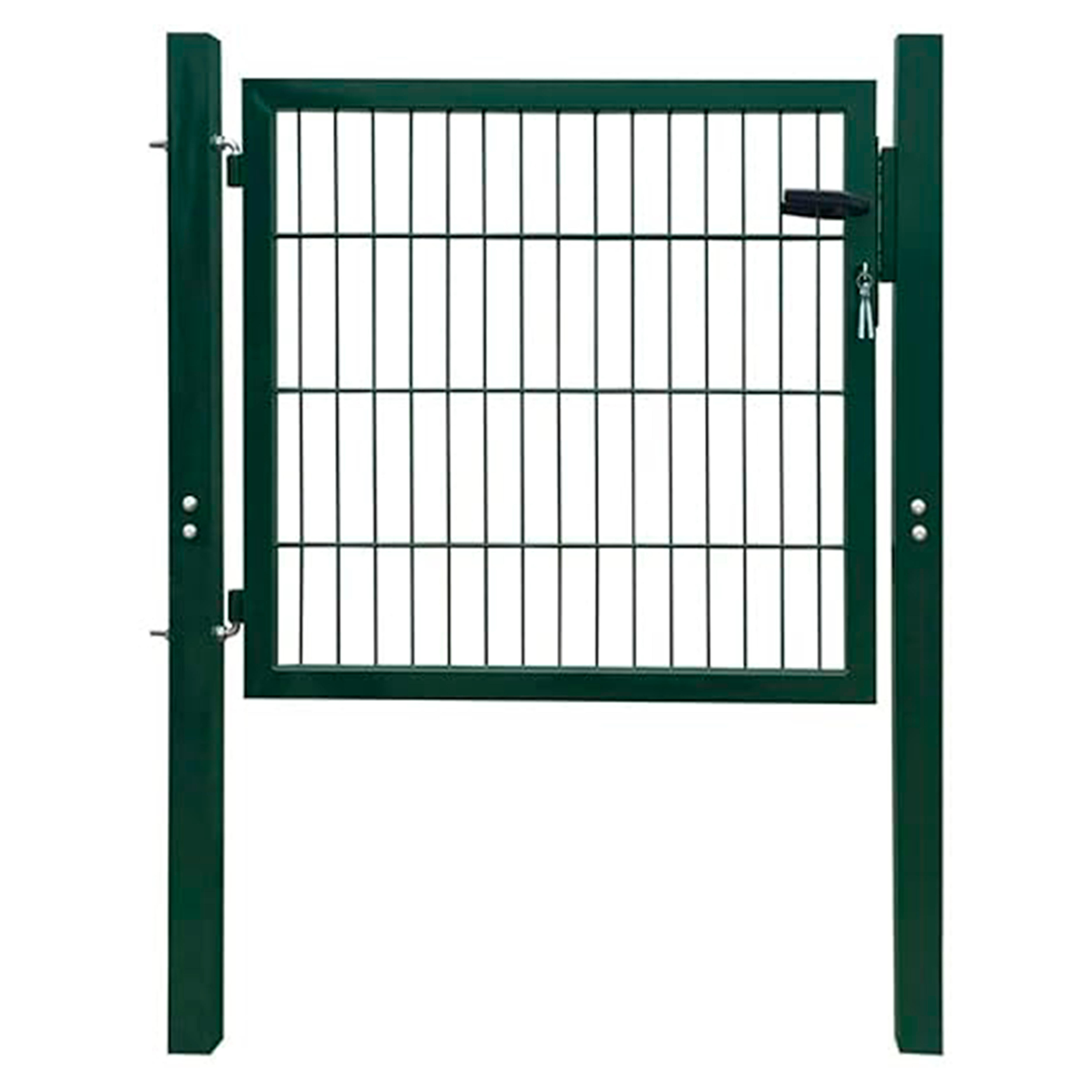 Puerta metálica verde de acero galvanizado y plastificado. Poste cuadrado. Muy resistente a la intemperie. El cuadro de la malla es de 50x50 mm y el alambre 4 mm de diámetro. Apertura reversible. Incluye bisagra de acero inoxidable, manilla, cerradura y llaves. Medidas 1x1.5 m.