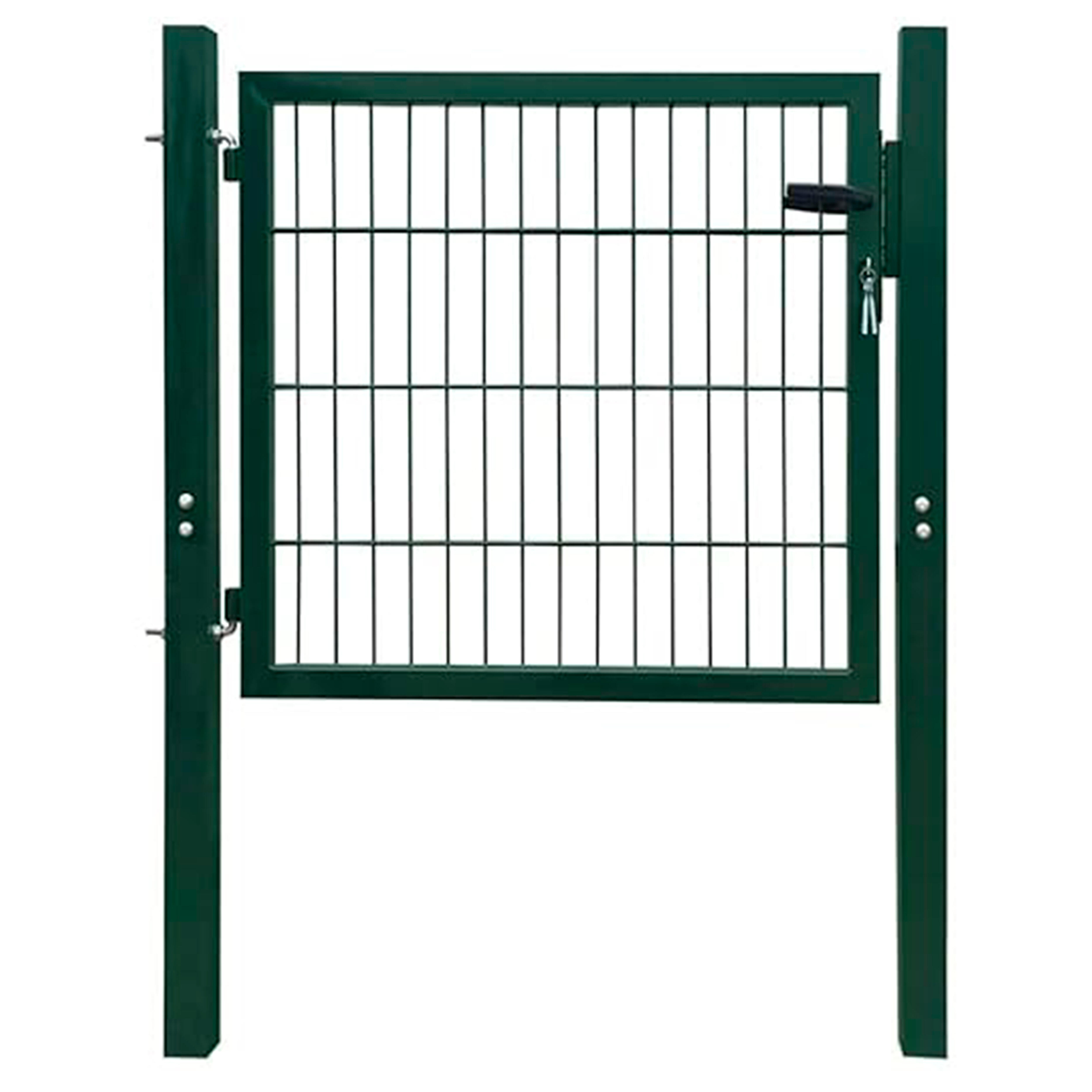 Puerta metálica verde de acero galvanizado y plastificado. Poste cuadrado. Muy resistente a la intemperie. El cuadro de la malla es de 50x50 mm y el alambre 4 mm de diámetro. Apertura reversible. Incluye bisagra de acero inoxidable, manilla, cerradura y llaves. Medidas 1x1 m.