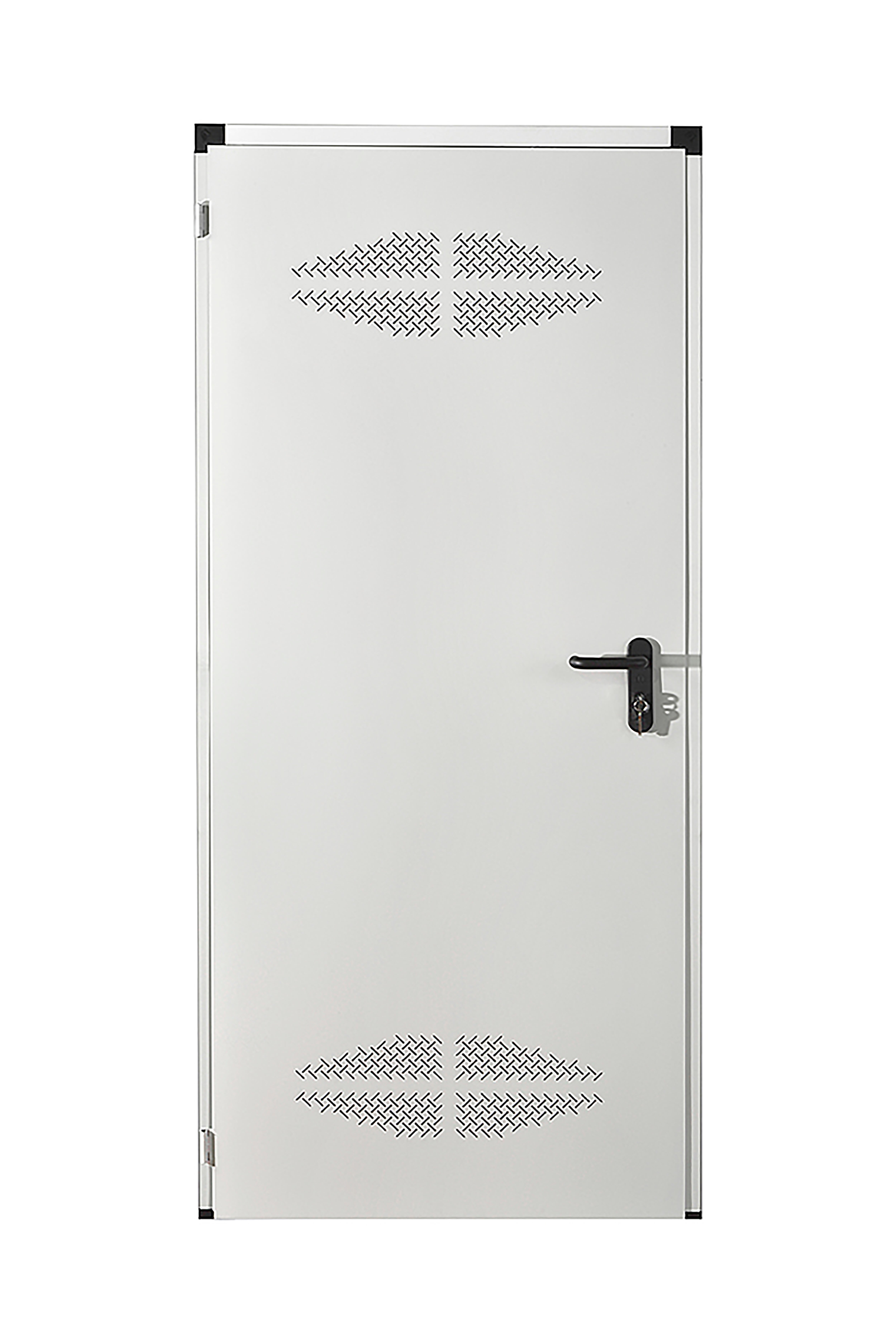 Puerta fabricada con dos chapas galvanizadas acabado blanco, rellenas de nido de abeja, con rejillas para la ventilación; de cierre hermético y funcionamiento silencioso. Marco perfilado para albergar tabique de 4 cm. Hueco de paso de 200 x 80 cm. Cerco directo a obra. Incluye manillas.