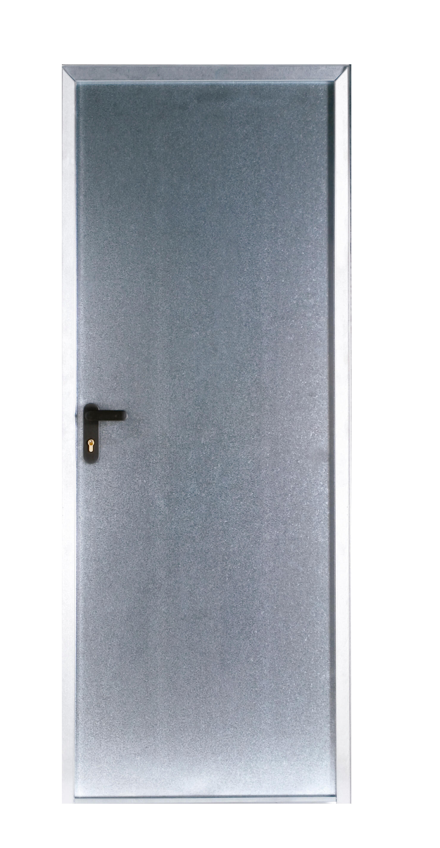 Puerta fabricada con dos chapas galvanizadas rellenas de poliuretano o nido de abeja, con rejillas para la ventilación; de cierre hermético y funcionamiento silencioso. Marco perfilado para albergar tabique de 4 cm. Hoja de 200 x 80 cm. Cerco directo a obra. Incluye manillas.