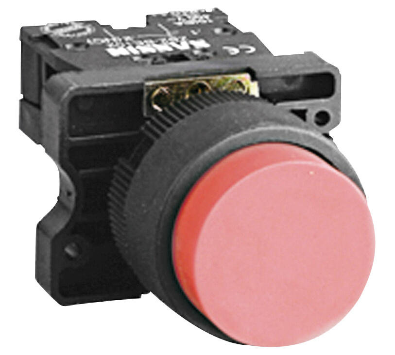 Pulsador con retorno de la serie indubox, diámetro 22mm 240v 3a 600v 6kv nc con botón rasante material termoplástico en color rojo. Resistente al fuego 850ºc. Material libre de halógenos.