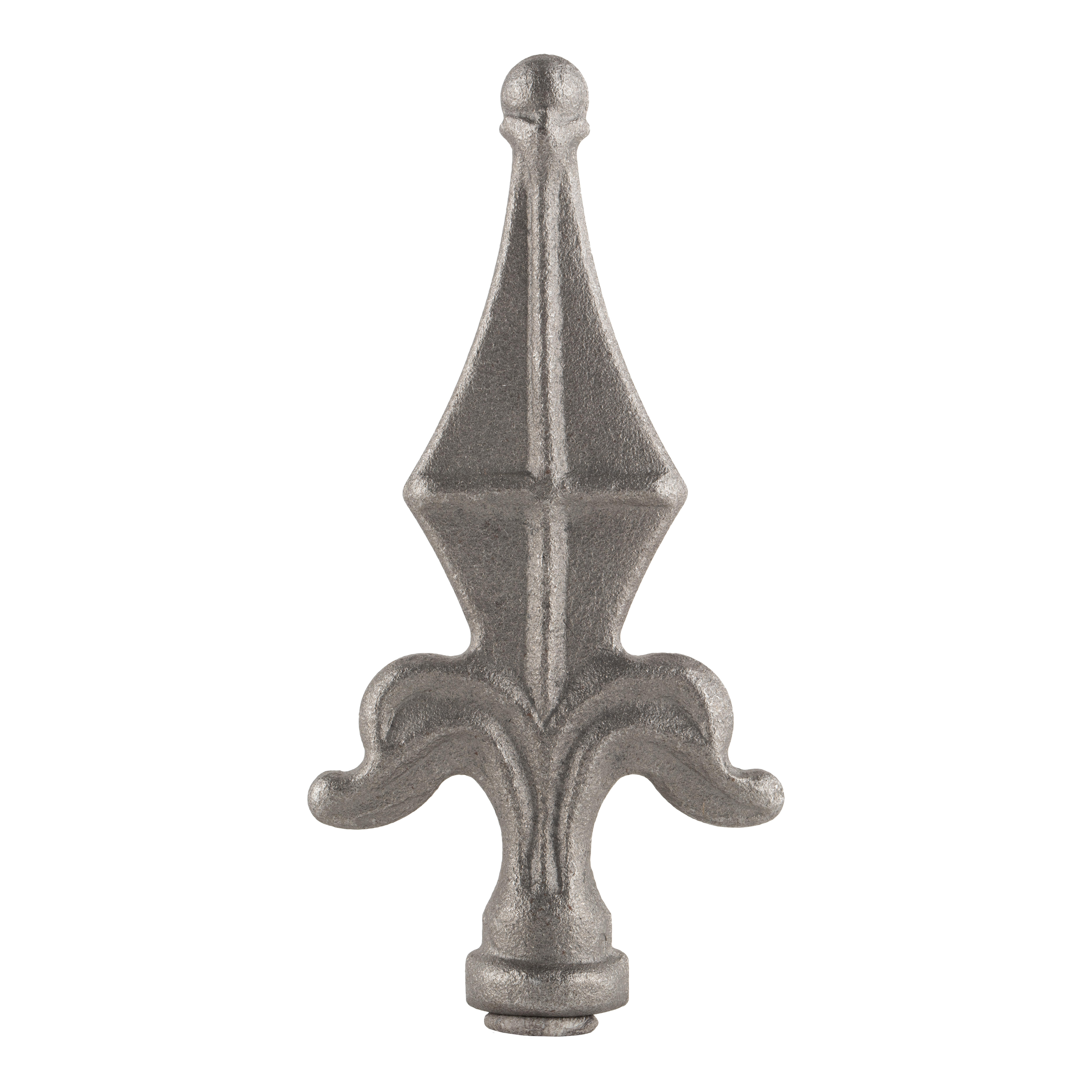 Punta lanza hierro forjado base redonda con medidas de alto 115mm, ancho 60mm y diametro de la base 21,5mm.