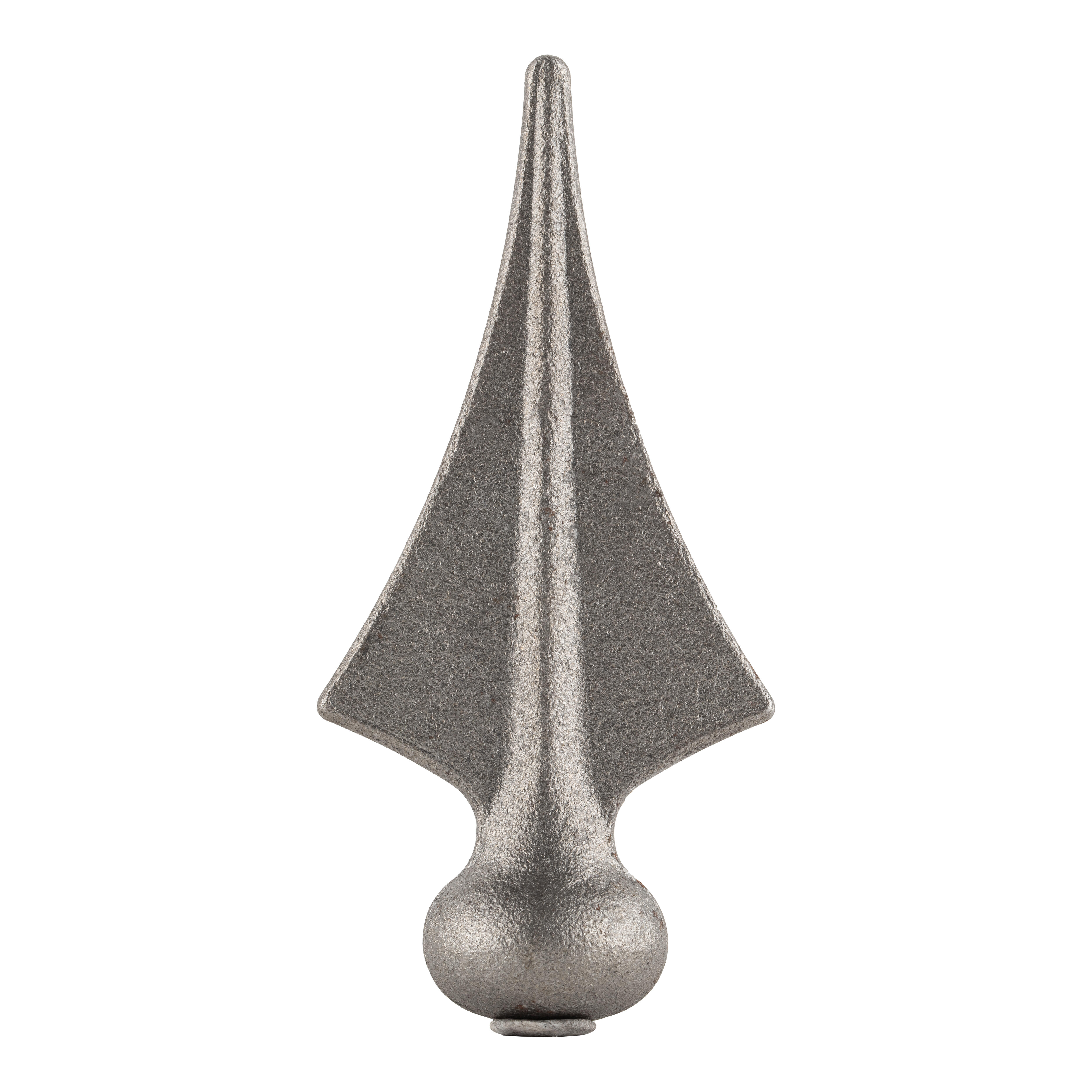 Punta lanza hierro forjado base redonda con medidas de alto 125mm, ancho 58mm y diámetro de la base 35mm.