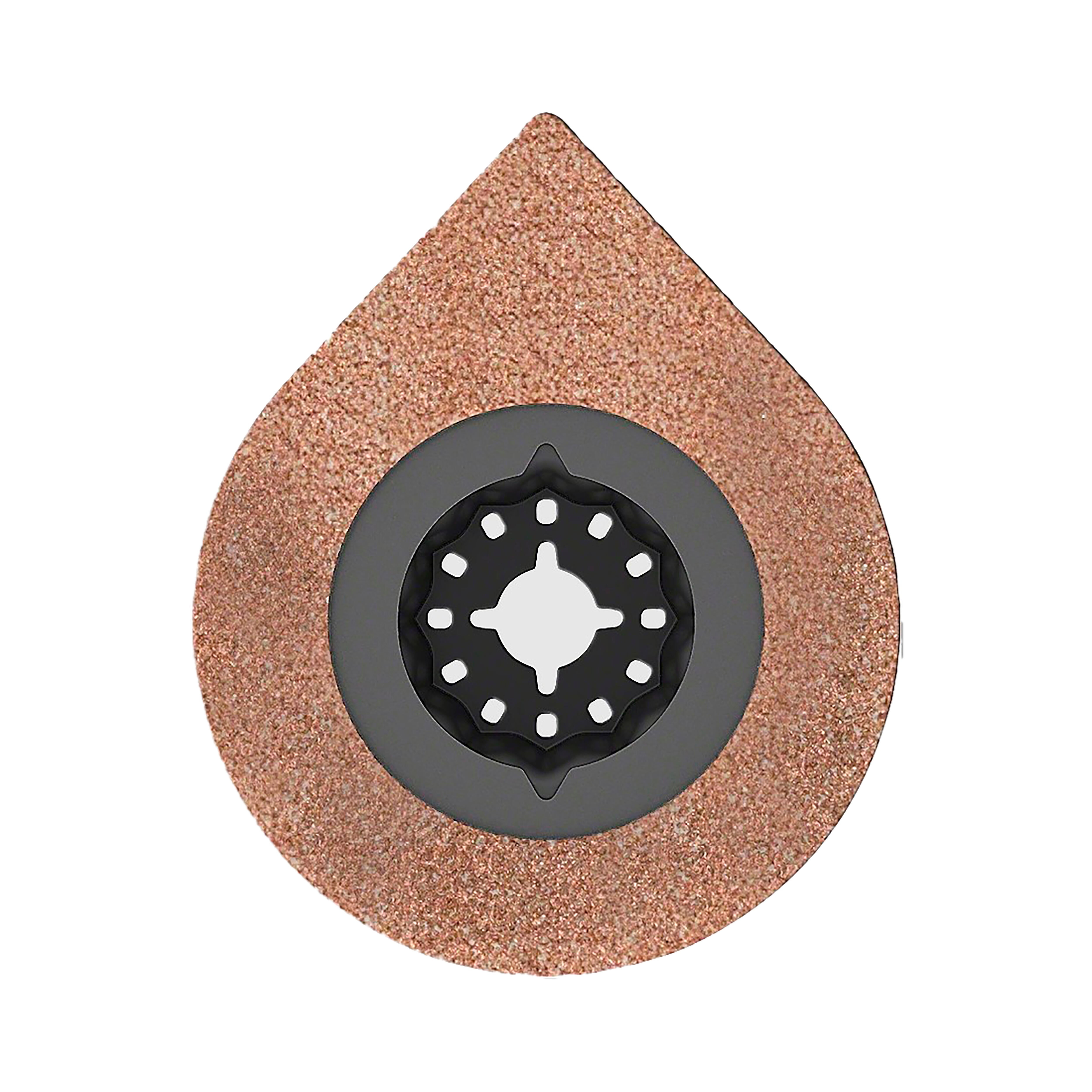 El rascador de mortero Starlock AVZ 70 RT4 proporciona tres funciones en un solo accesorio. En primer lugar, su punta redondeada con recubrimiento de carburo de alta calidad elimina la lechada y el mortero en esquinas estrechas. En segundo lugar, la arista de corte de la placa elimina eficazmente las juntas de lechada entre baldosas. En tercer lugar, su recubrimiento de grano de carburo elimina rápidamente y sin esfuerzo el mortero y el adhesivo para baldosas. El accesorio está recubierto con grano 40 de carburo resistente .
