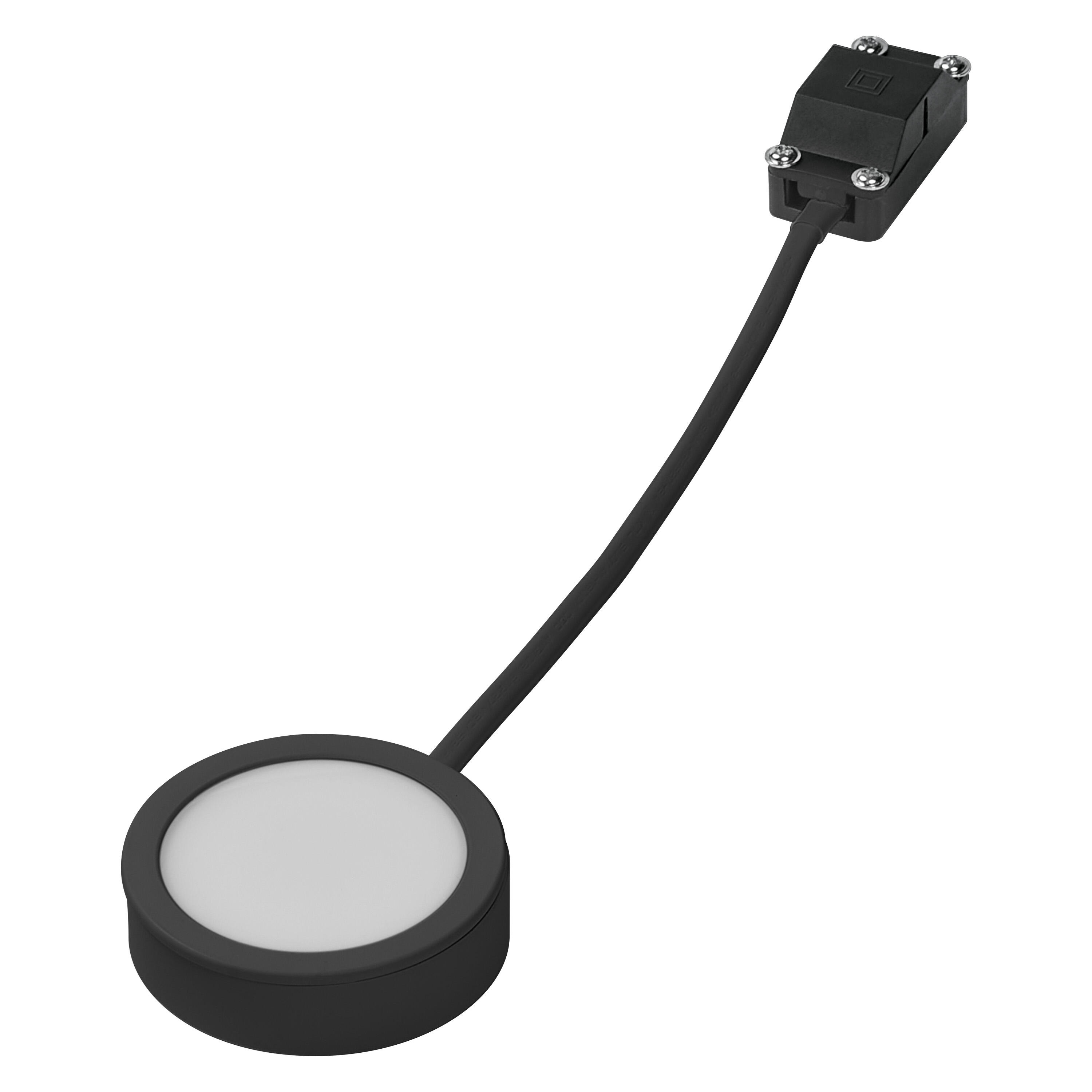 Luminaria led circular para instalación de empotrar o superficie. Acabado negro y 3W de potencia y tono de luz blanco cálido. 65mm de diámetro. Ideal para iluminación bajo mueble, proporcionando un diseño moderno y eficiente.
