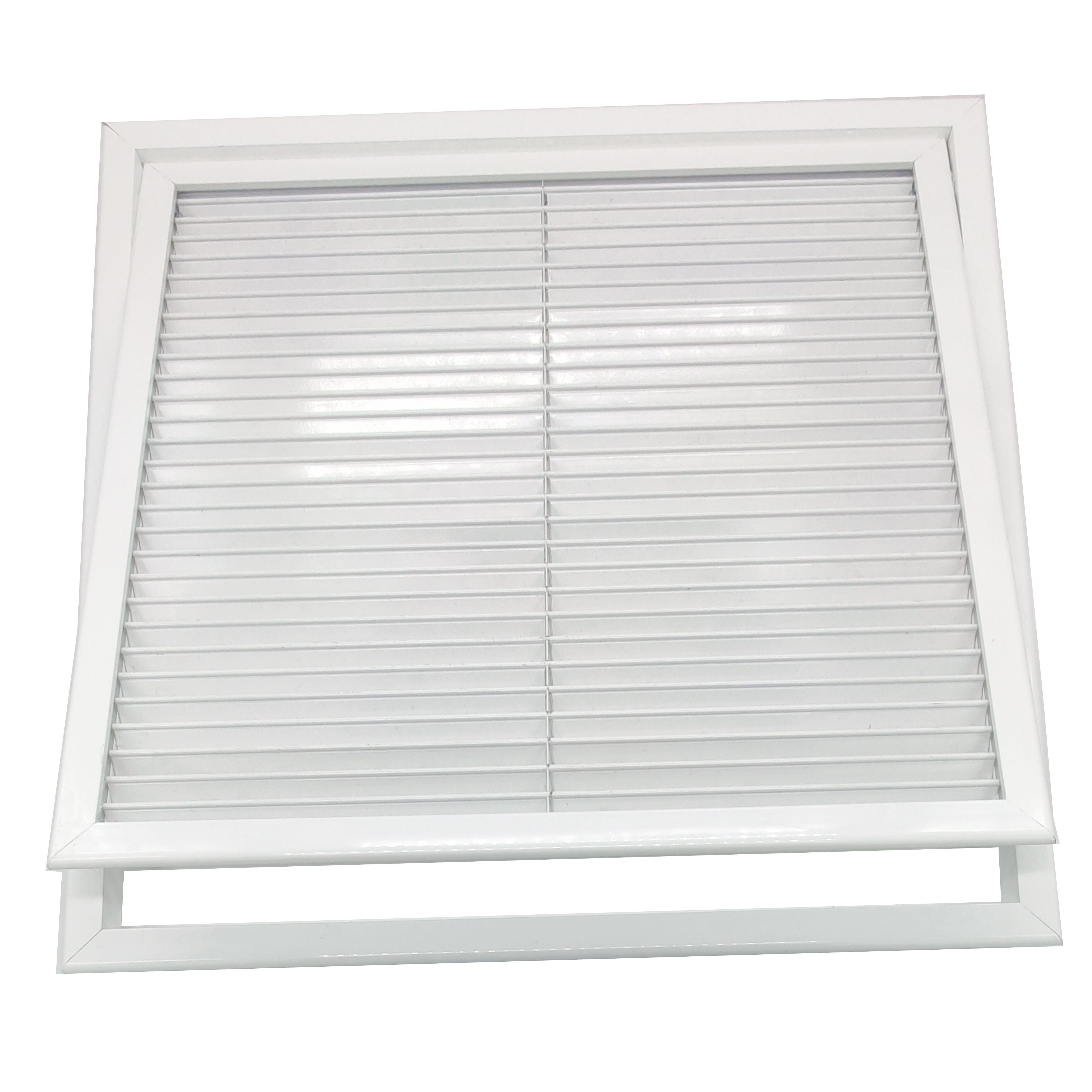 Rejilla de abatible de lamas fijas a 45º. Abatible. Sin regulación de caudal. Dimensiones 595x595. Hecha de Aluminio anodizado y en color blanco.