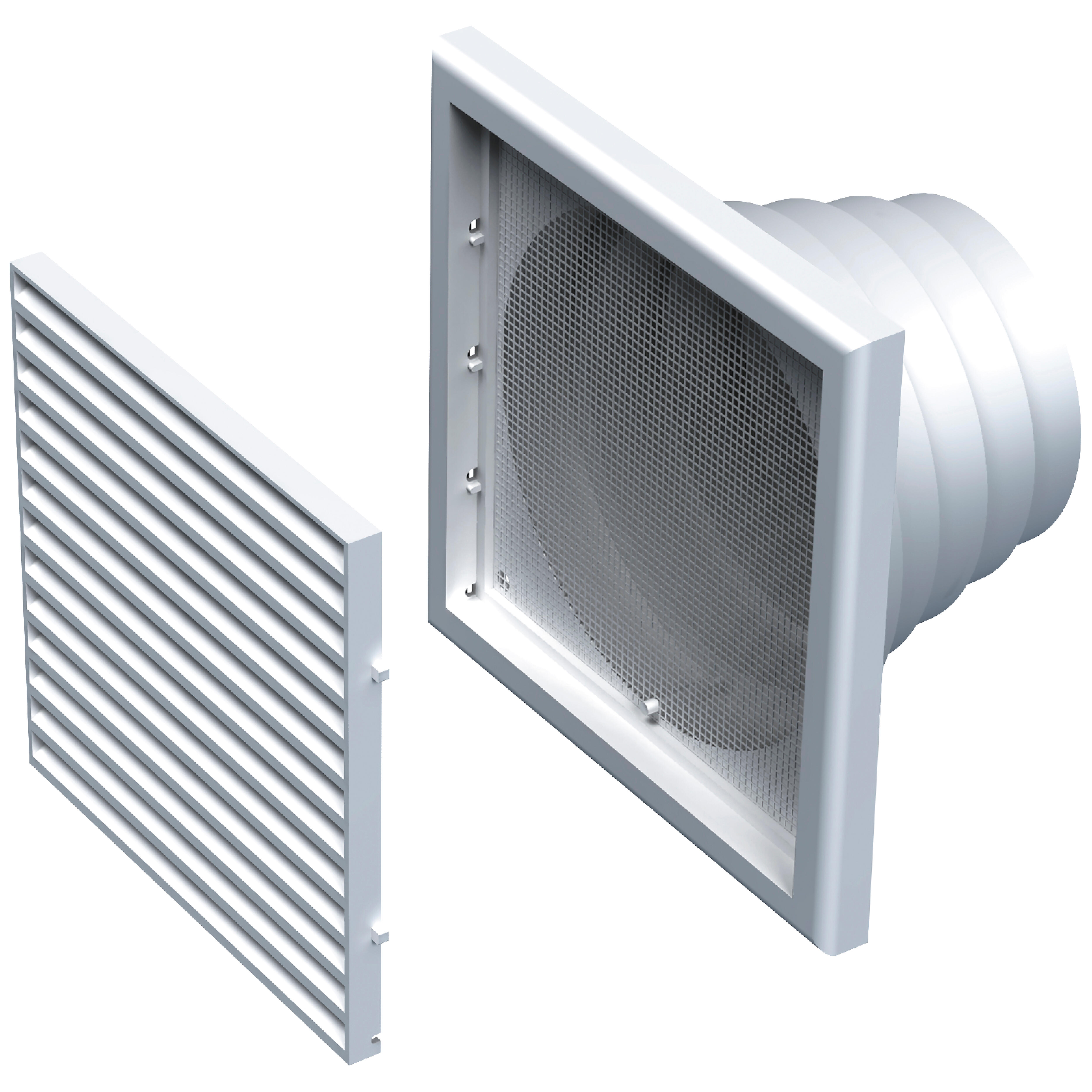 Permite la aportación de aire en impulsión y la descarga en extracción. Aletas inclinadas. Consta de malla antimosquitos. El material es plástico blanco. La fijación del cuerpo de la rejilla se realiza con tornillos que quedan ocultos detras de un panel frontal amovible para facilitar el mantenimiento.