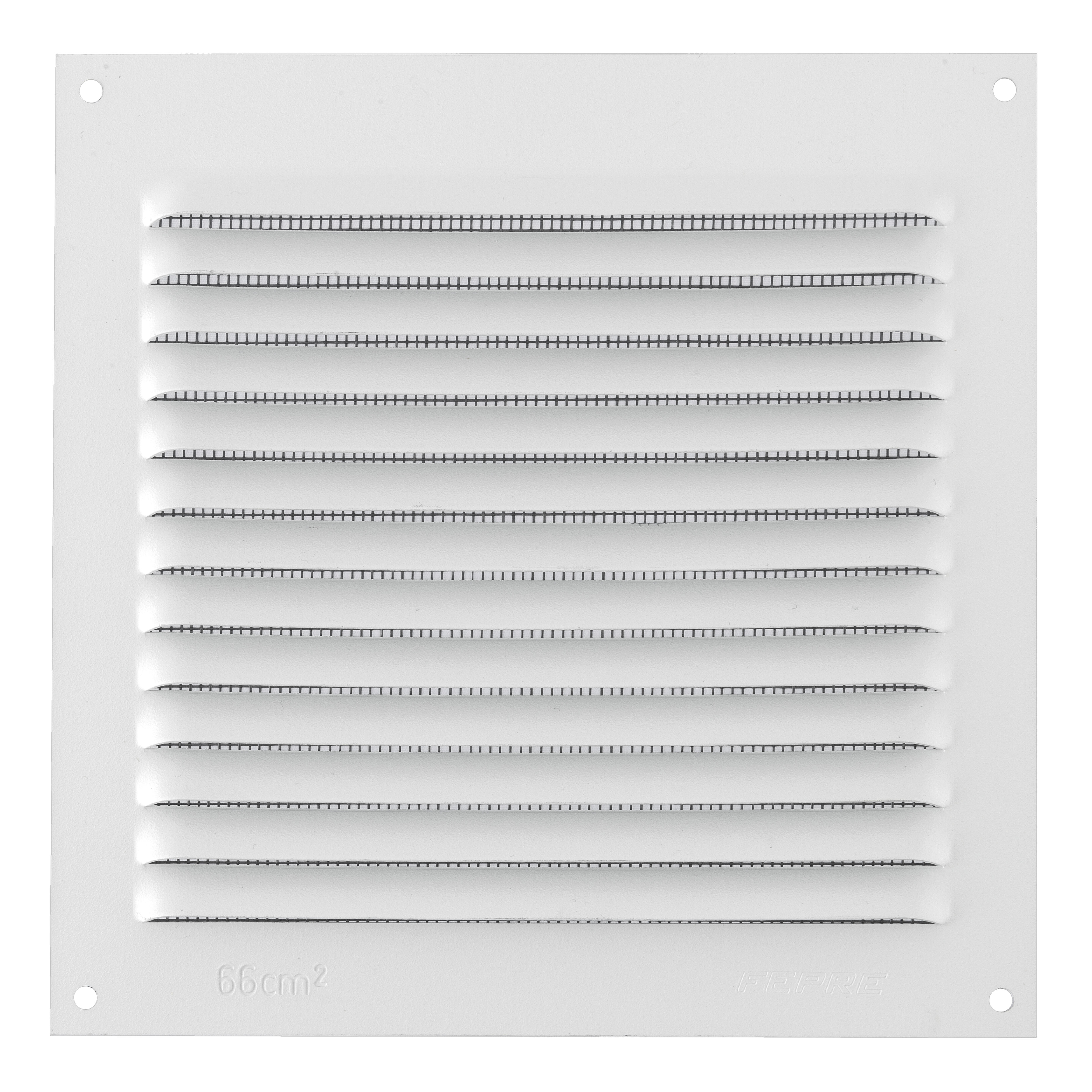 Rejilla de ventilación para sobreponer con mosquitera, realizada en aluminio bruto. Espesor 0.8 mm Color: Blanco