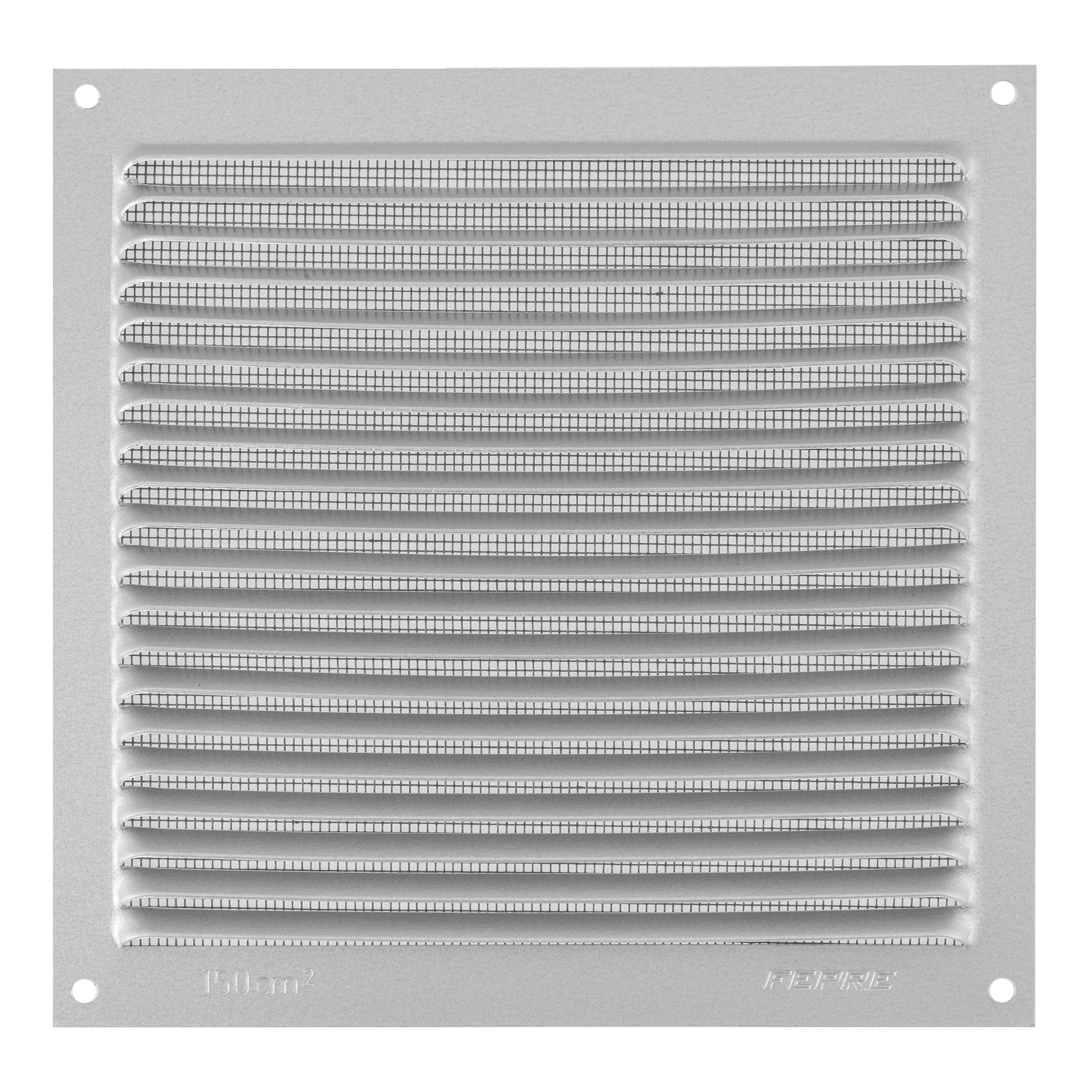 Rejilla de ventilación para sobreponer con mosquitera, realizada en aluminio bruto. Espesor 0.8 mm Color: Gris Plata