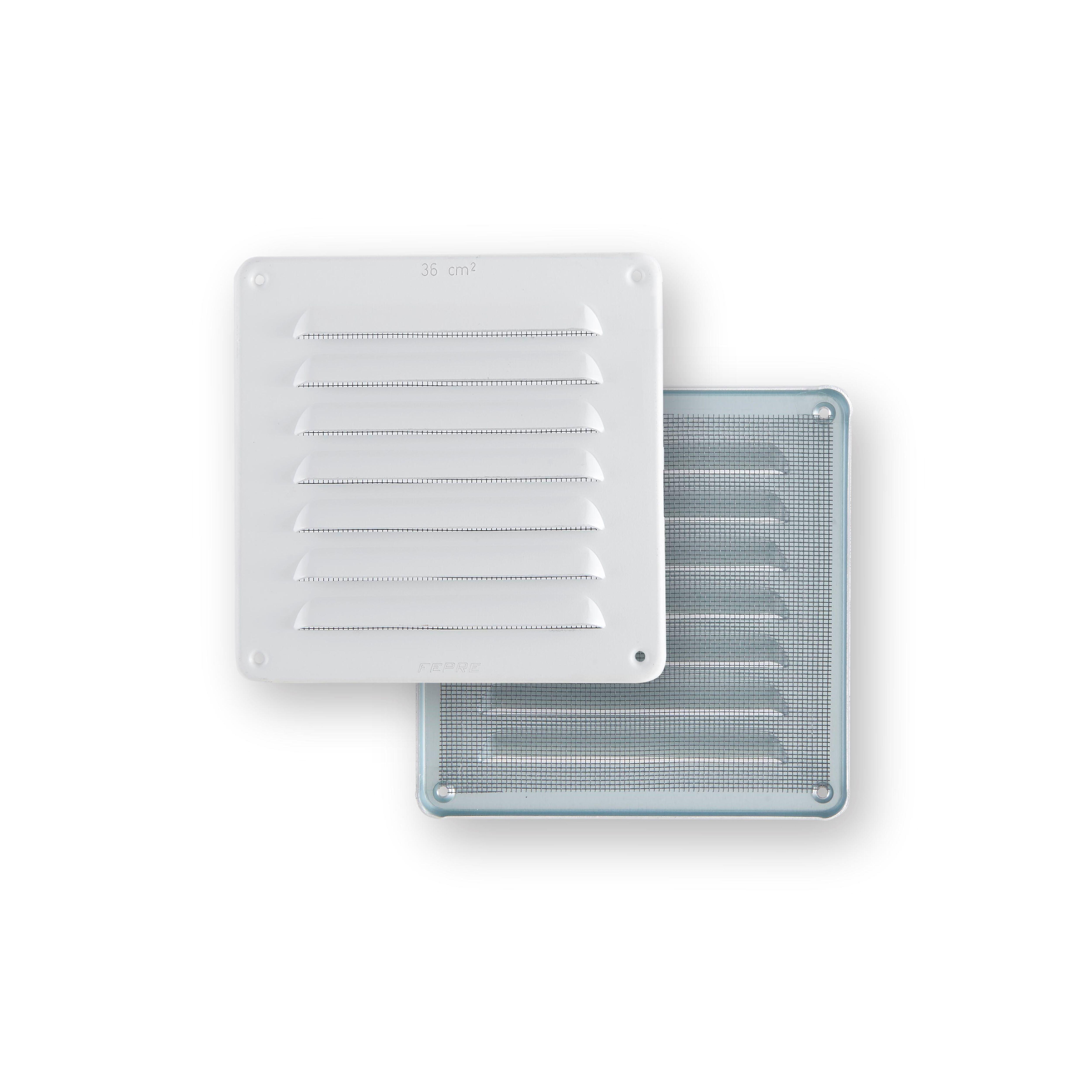 Rejilla de ventilación para atornillar, con mosquitera, realizada en aluminio. Dimensión exterior 15 x 15 cm y grosor de 1.5 mm en color blanco RAL 9016 Paso de aire 36 cm2. Especial gas. Lamas tipo persiana. Para interior o exterior.