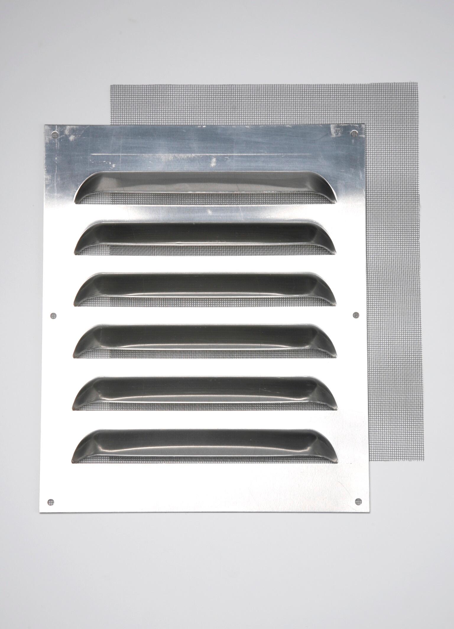Rejilla reforzada sin borde realizada en aluminio, con mosquitera, dimensiones 30 x 25 cm espesor 1.5 cm, color aluminio, paso de aire 162 cm2 Especial gas.