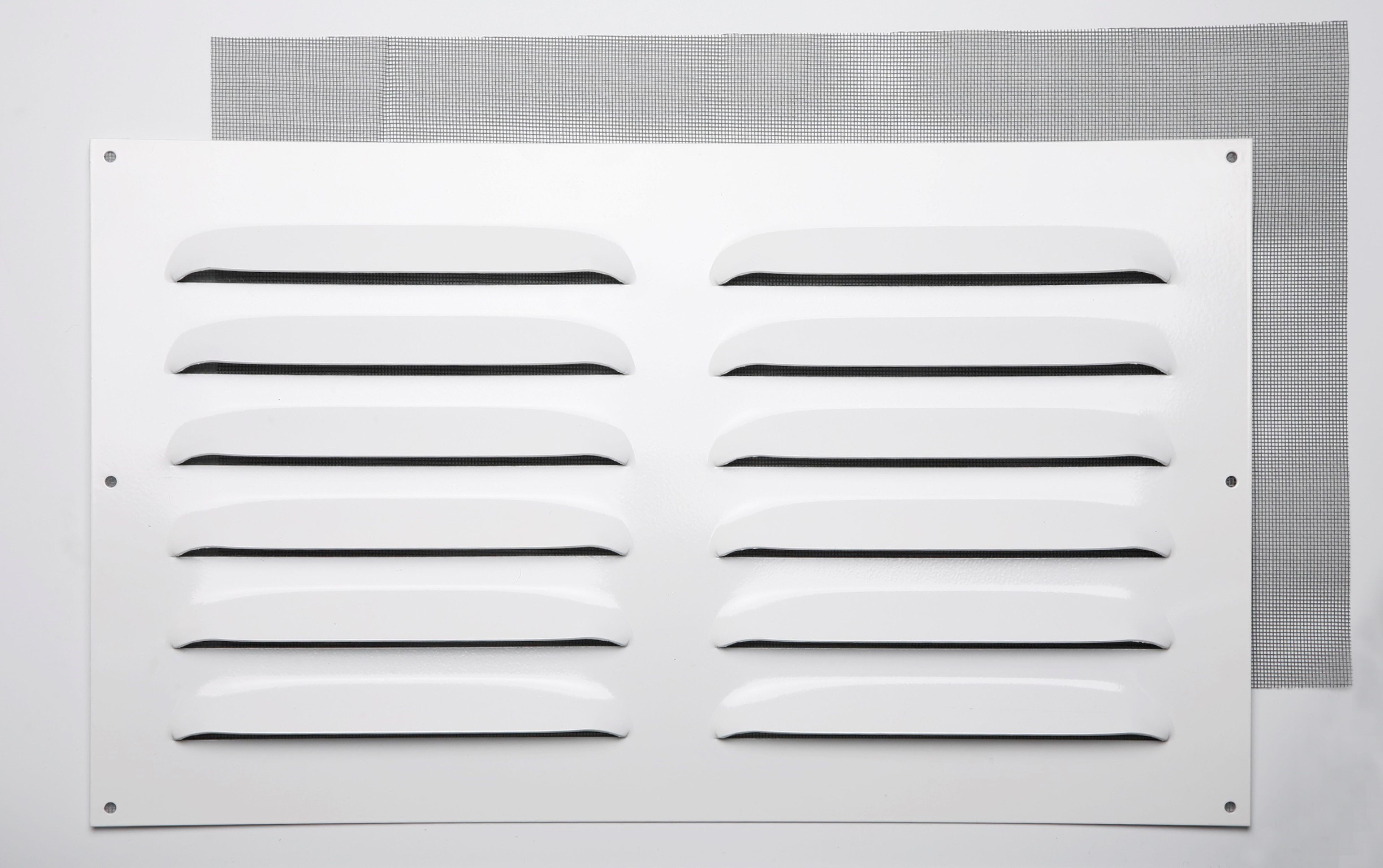 Rejilla de ventilación de aluminio con mosquitera, reforzada y sin borde 30 x 50 cm Grosor 1.5 cm color blanco, paso de aire 324 cm2 y regulable.