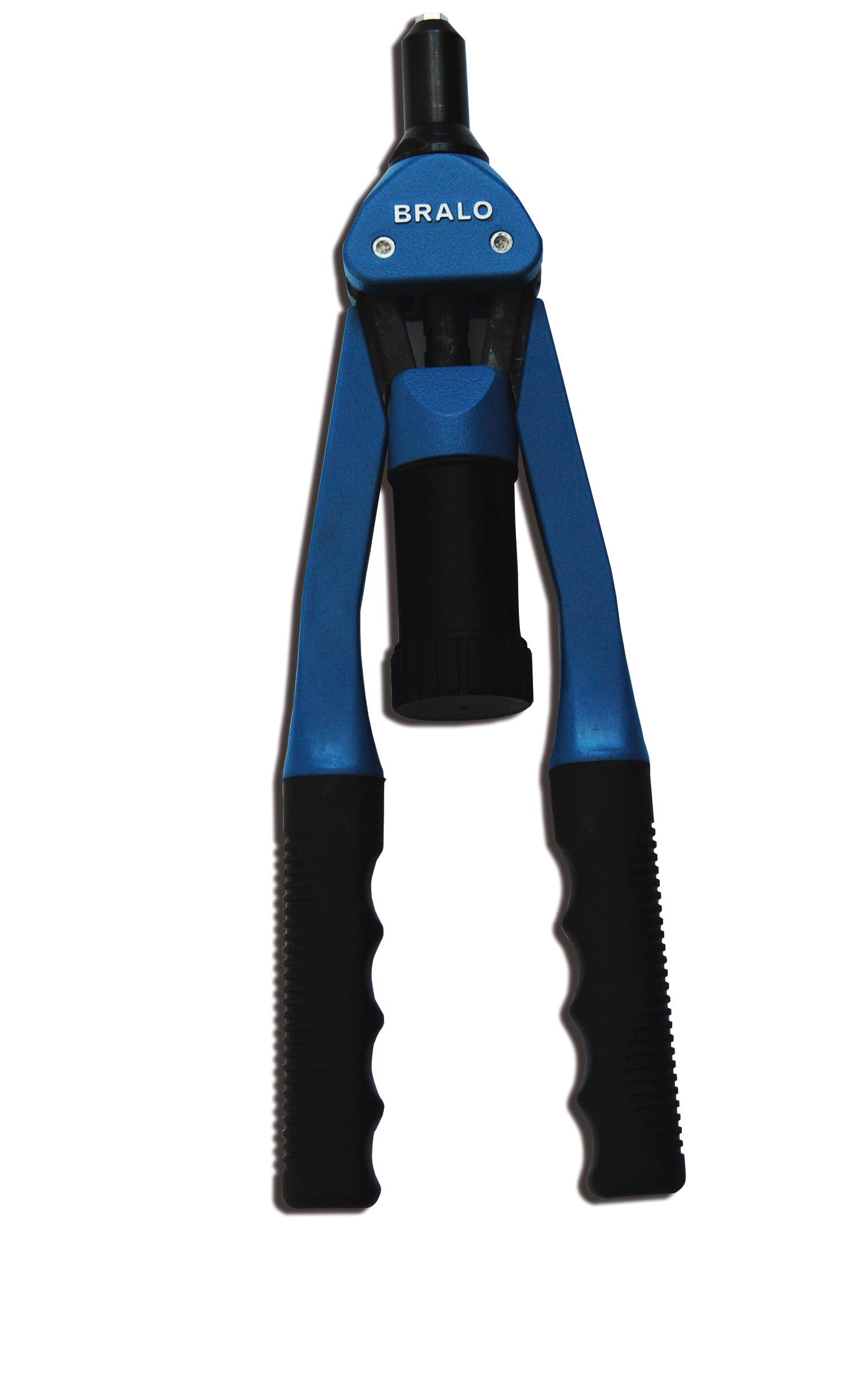 Remachadora manual dos brazos. Capacidad de remachado de hasta 6,0 mm, 4,8 estructural y 6,4 S-Trébol. El cuerpo principal está fabricado en fundición de aluminio de alta densidad. Las palancas y los anclajes están construidas con acero de alta calidad. Empuñaduras ergonómicas que facilitan el remachado. Dispone de alojamiento para el juego de boquillas.