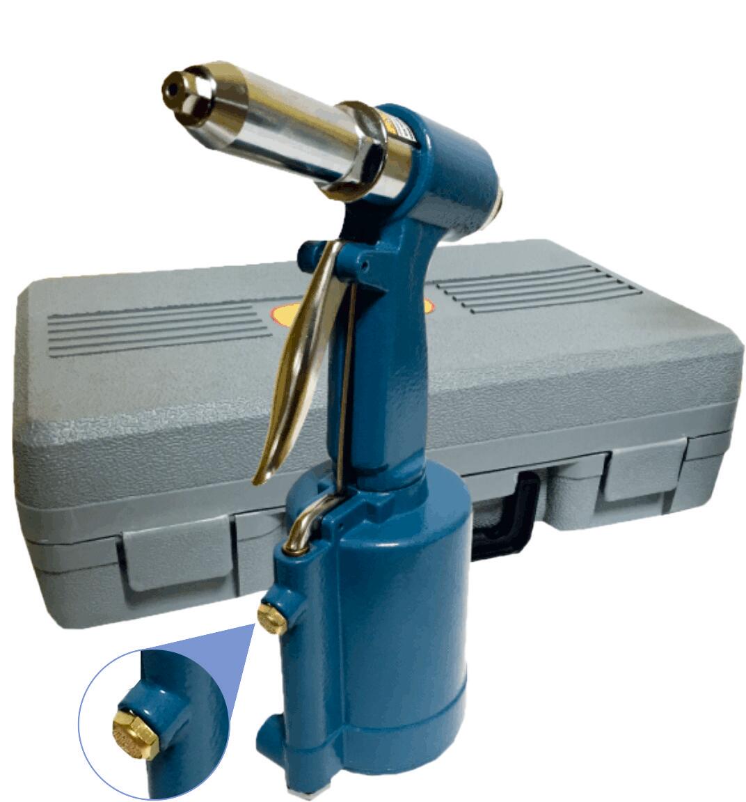 Remachadora neumática en maleta. Capacidad máxima de remachado 4.8mm.onsumo de aire 1,5l/golpe. Presión de trabajo 6-7 kg. Incluye boquillas de 2mm hasta 4,8mm.