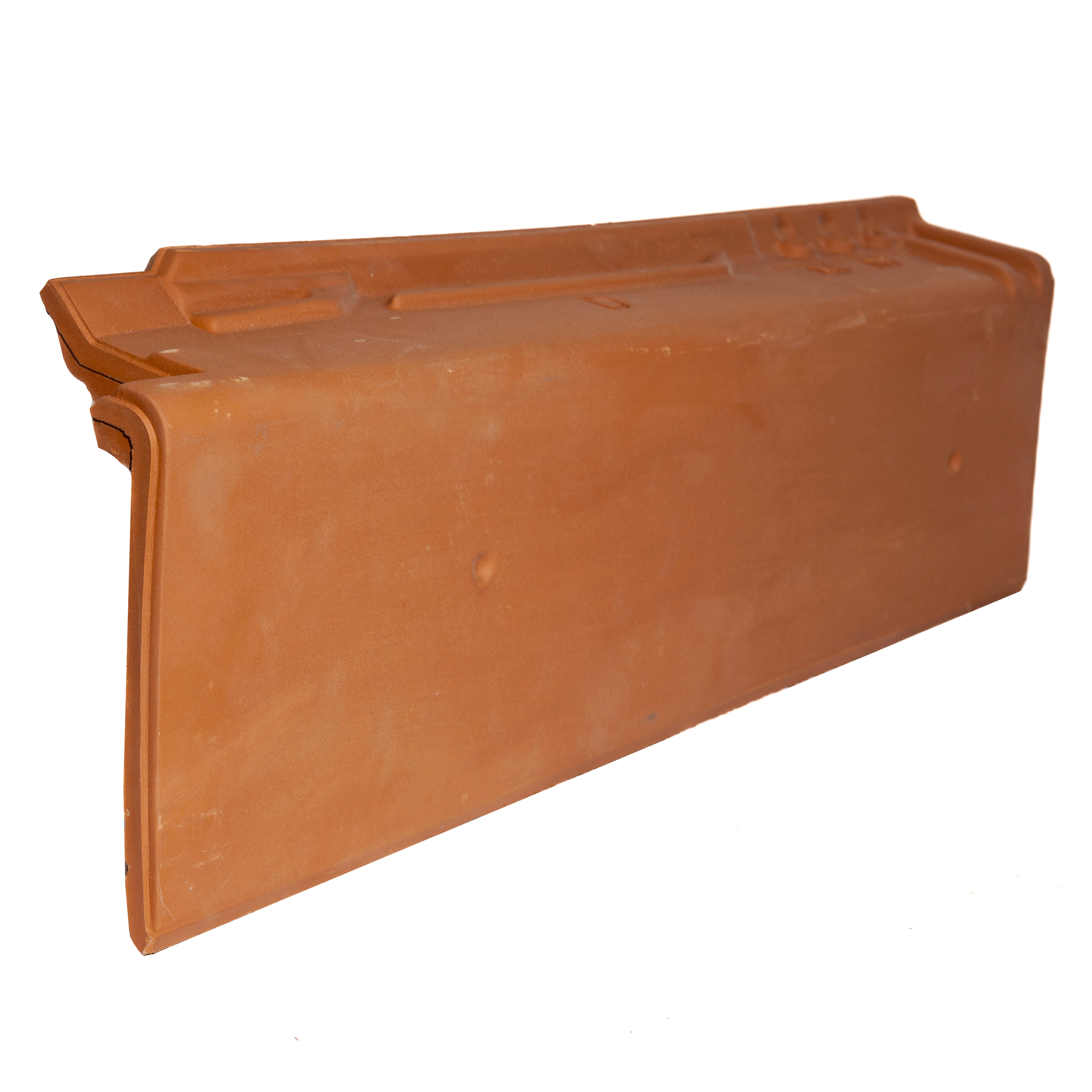 Remate lateral derecho para teja cerámica klinker hydra de color rojo. Pieza para el remate del lateral derecho del faldón, manteniendo la misma estética y prestaciones de toda la cubierta, y protegiendo esa zona frente a los agentes atmosféricos. Protege el encuentro entre el faldón y la fachada. Proporciona estanqueidad y protección al viento.