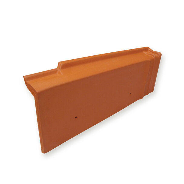 Remate lateral derecho para teja cerámica mixta de color rojo flameado. Pieza para el remate del lateral derecho del faldón, manteniendo la misma estética y prestaciones de toda la cubierta, y protegiendo esa zona frente a los agentes atmosféricos. Protege el encuentro entre el faldón y la fachada. Proporciona estanqueidad y protección al viento.