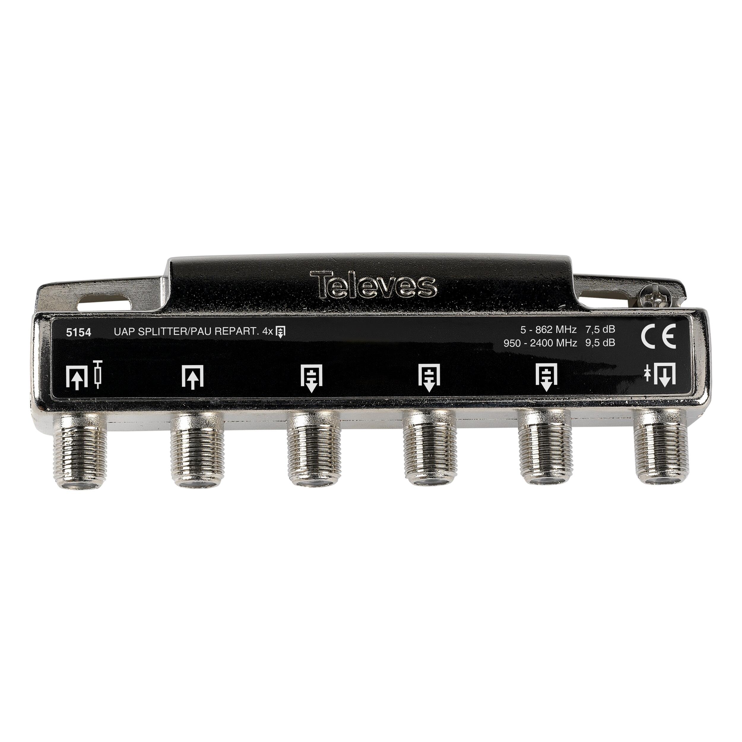Repartidor de 4 direcciones con pau y conectores f, para señales de smatv. el pau (punto de acceso de usuario) ofrece una entrada adicional cargada para conexion de la segunda bajante contemplada en una instalacion realizada segun el reglamento ict-2. es de instalacion interior, pero tambien es apto para exterior siempre dentro de un cofre (ref. 4163).