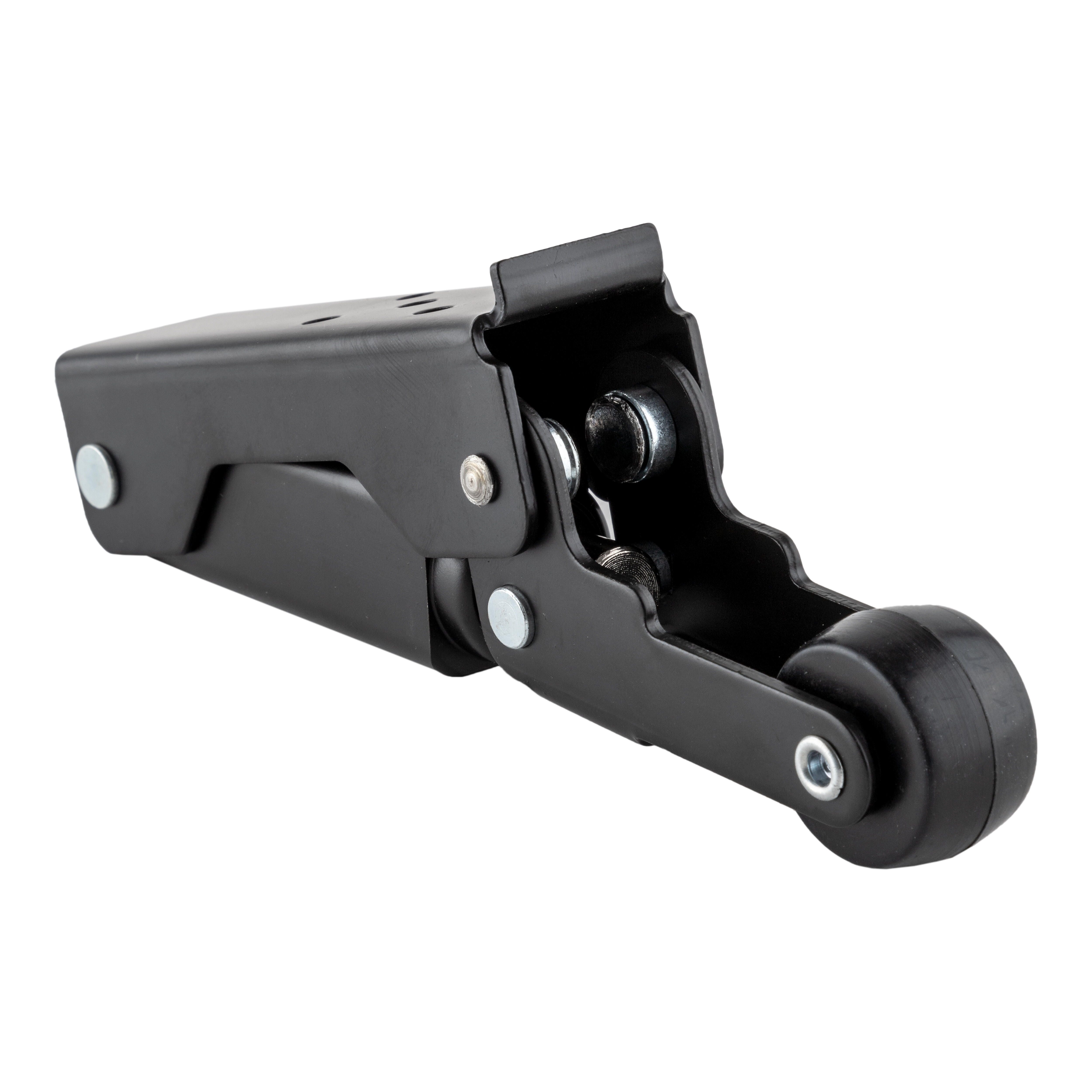 Retenedor para puertas de 40 kilos. Actúa como freno a la puerta y ayuda al cierre. Cilindro de aluminio. Medida del cuerpo 108 x 32 mm y del soporte 70 x 50 mm. Acabado pintado negro