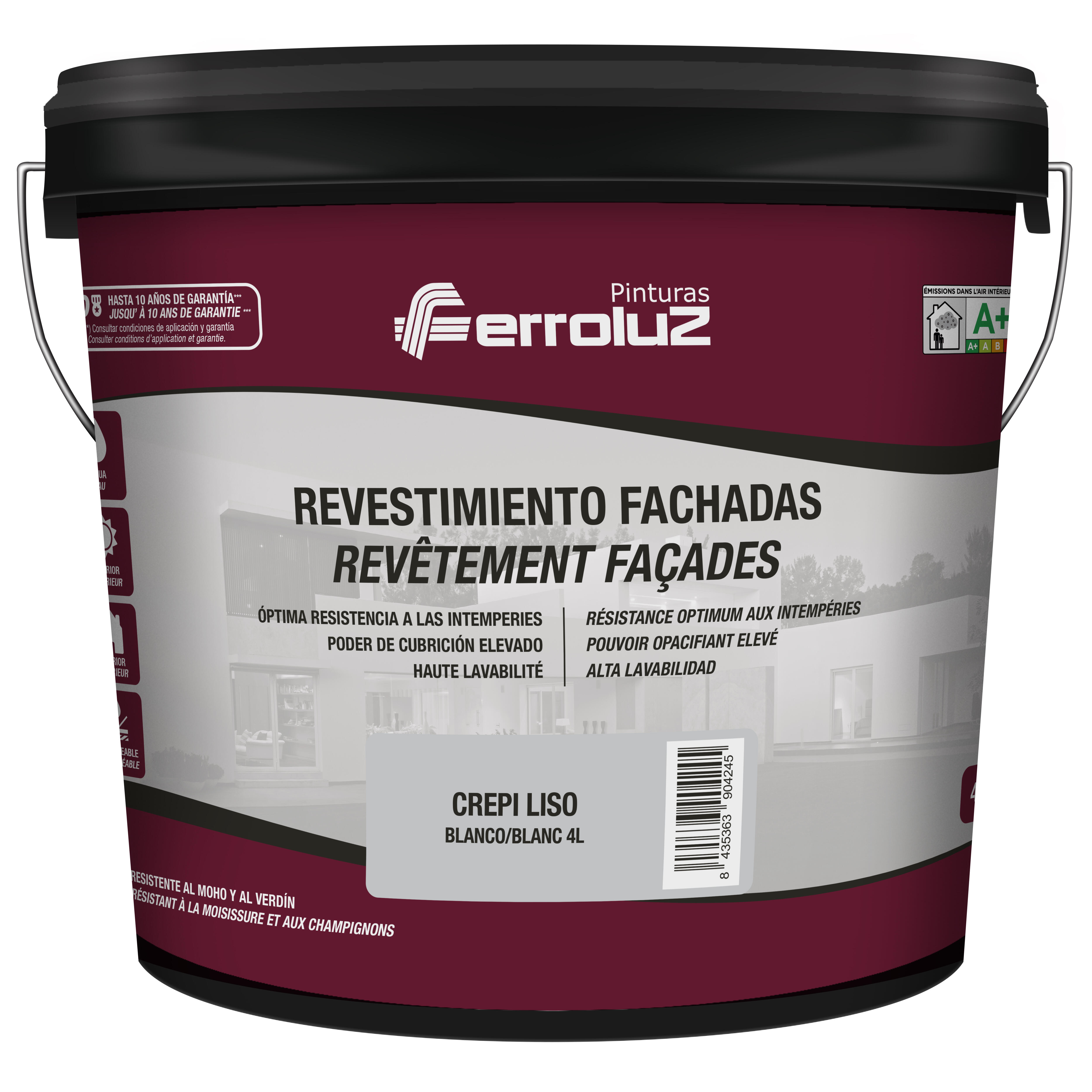 Pintura para fachadas blanca con acabado mate y liso, 4l. Uso exterior. Rendimiento: +/- 5-7 m2/l. Para la protección y decoración de paredes y techos con conservante antimoho en su composición.