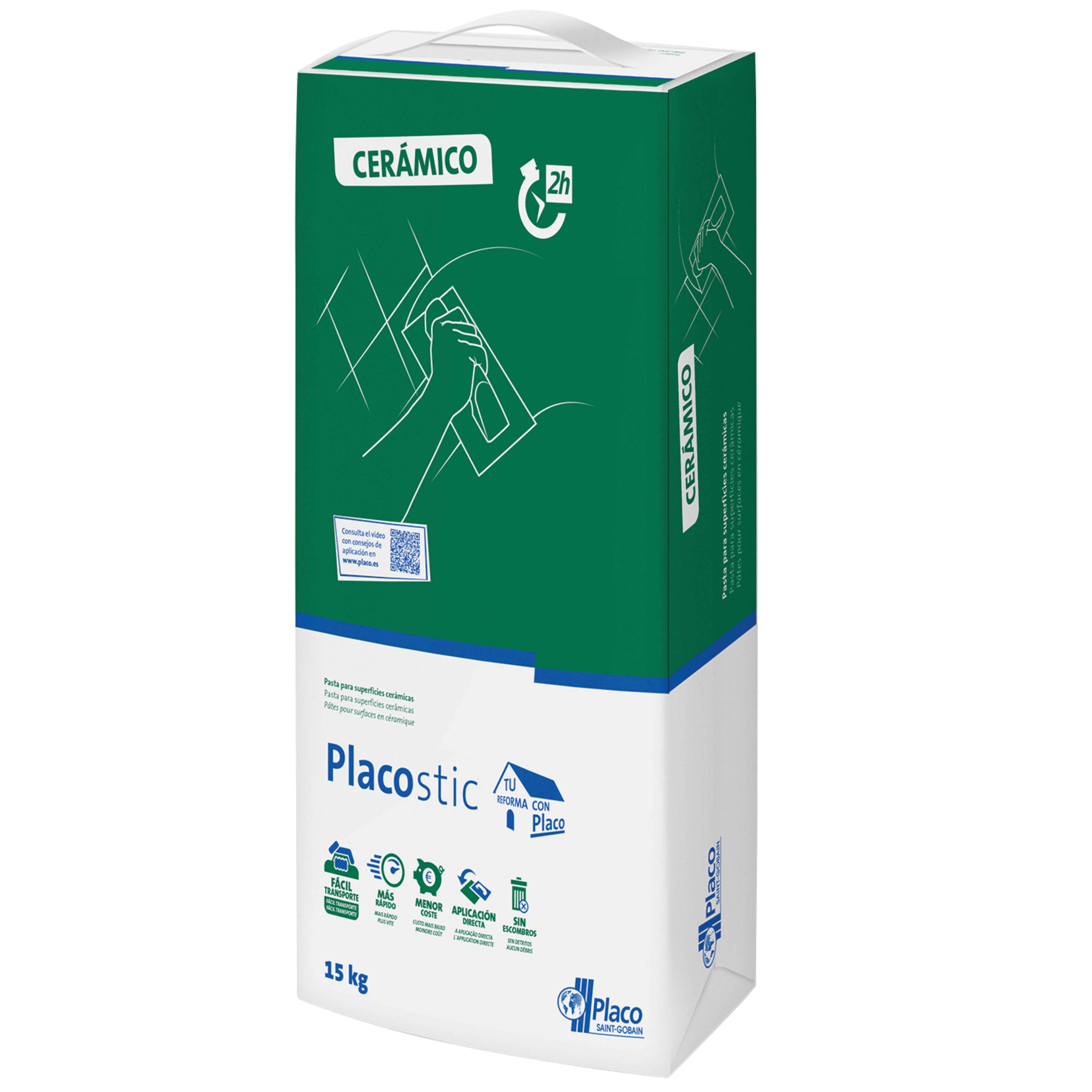 Pasta de revestimiento PLACOSTIC sobre superfices cerámicas interiores para ser recubiertas con pintura: vítreas o mosaicos en interior. Fácil mezclado, aplicación y lijado quedándose listo para pintar. Saco de 15 kg.
