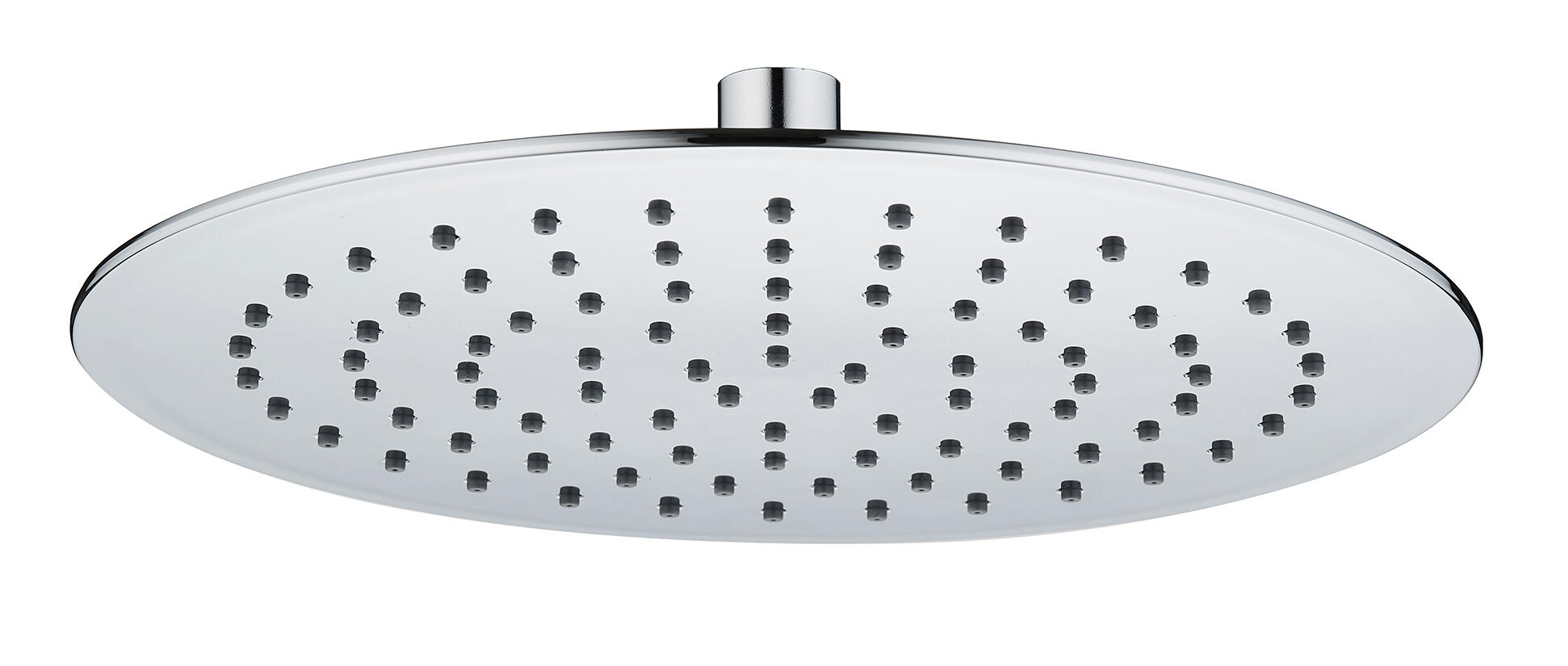 Rociador de ducha redondo extra plano, Ø 250 mm fabricado en ABS cromado. Orientable. Con picos suaves de silicona antical incorporados en el rociador. 1 chorro efecto lluvia
