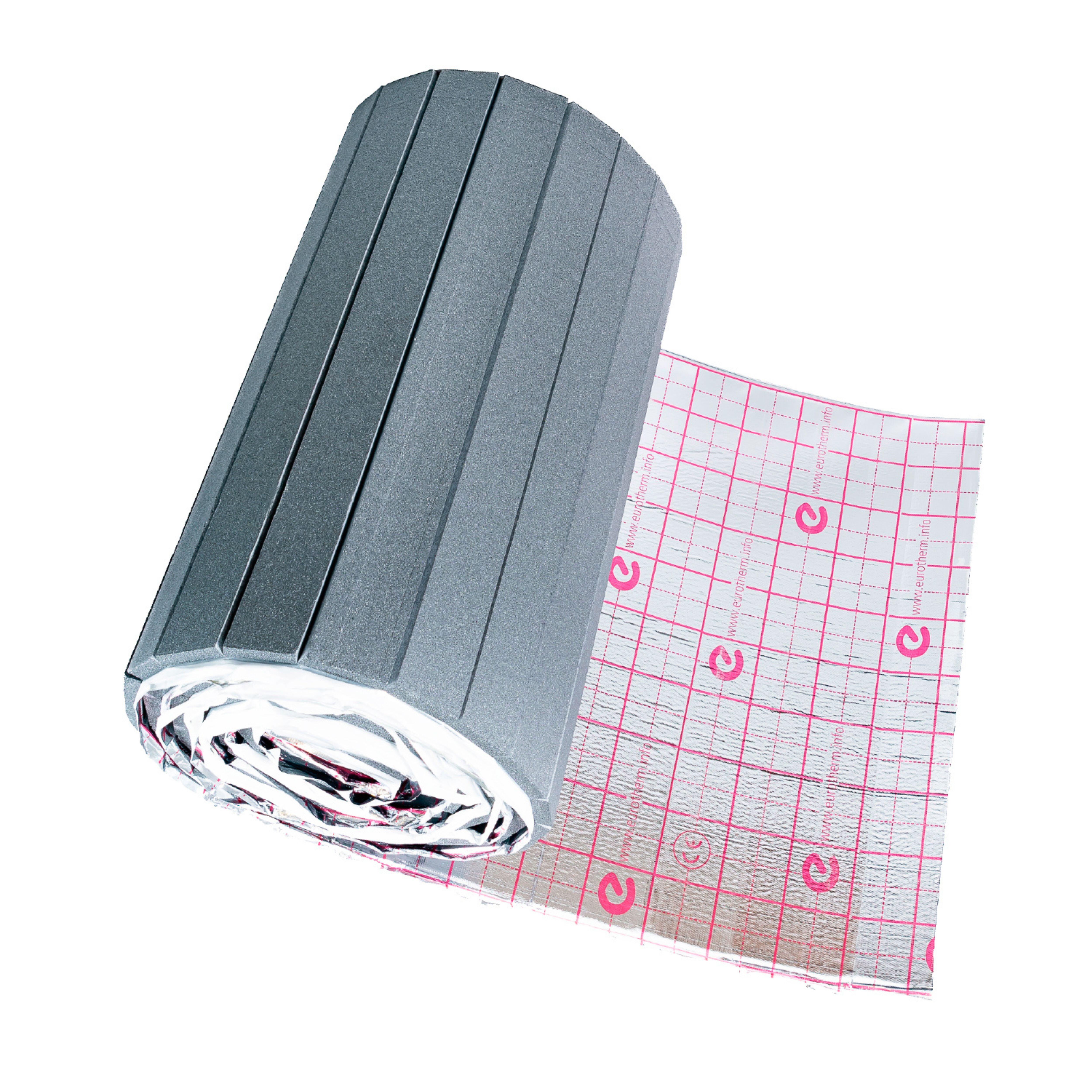 Plancha aislante europlus-flex de poliestireno expandido, revestida en la parte superior por una funda multicapa de aluminio dotada de marca guía para la colocación del tubo y fijación de las grapas sujeta-tubos.