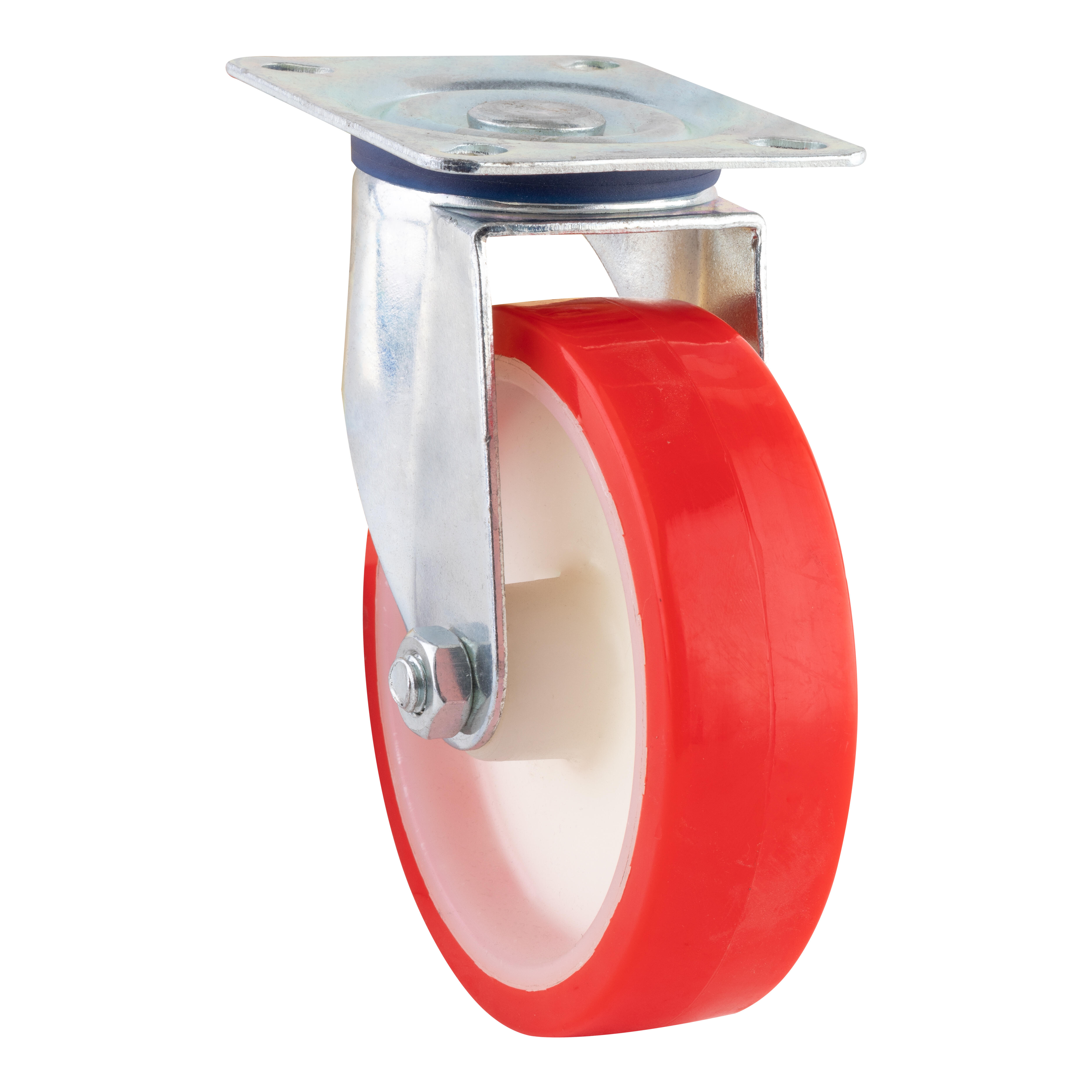 - Ventajas del producto: esta rueda combina un núcleo de poliamix con una banda de poliuretano rojo, proporcionando una excelente durabilidad y resistencia a la abrasión, su acabado cincado brillante asegura una protección contra la corrosión, los doble hilera de bolas favorecen un giro suave, y su capacidad de carga de hasta 150Kg la convierte en una opción segura y eficiente para diferentes usos.