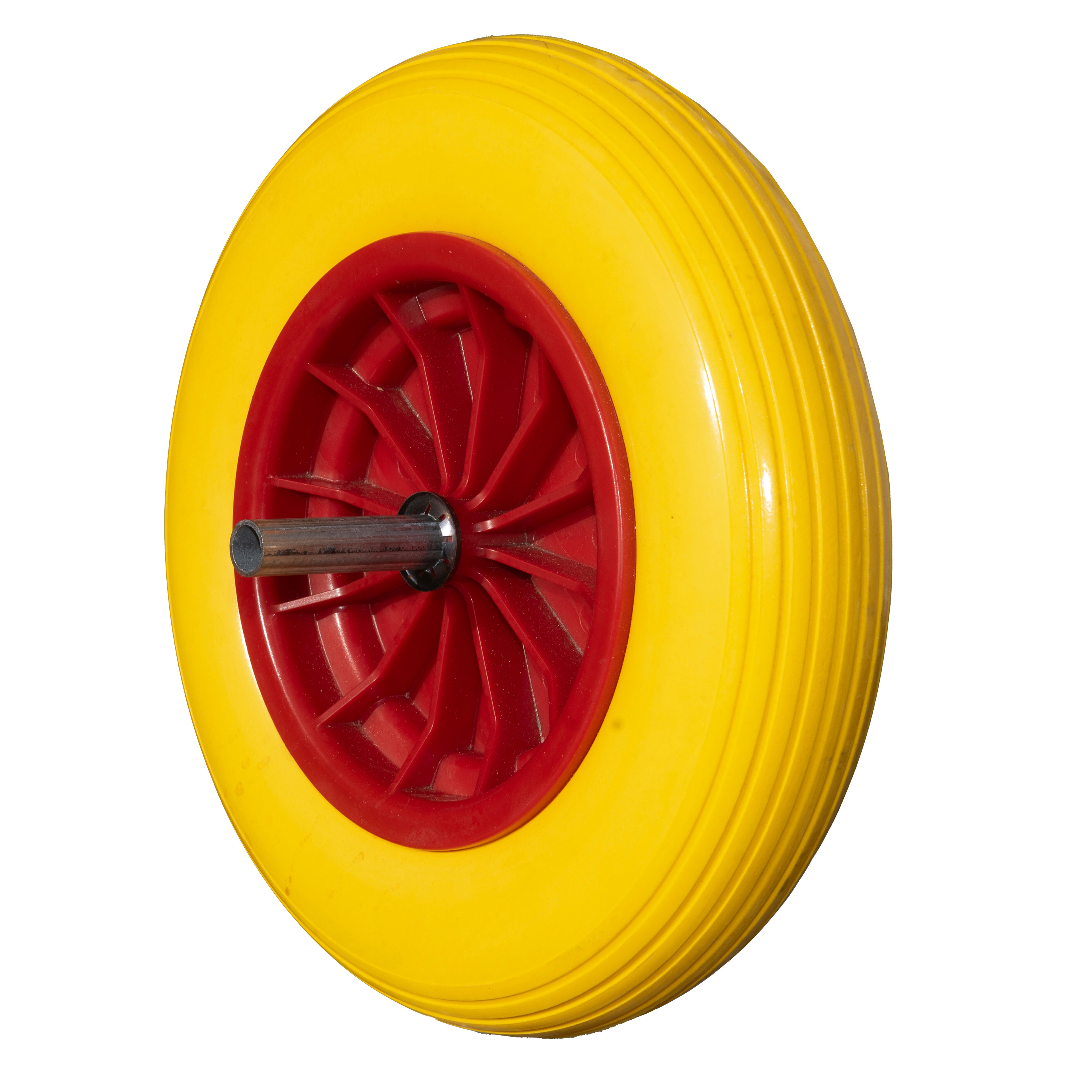 Rueda impinchable para carretilla, con eje de acero extraíble para adaptación a diferentes carretillas, llanta de polipropileno y neumático de poliuretano con mezcla de polímeros.
