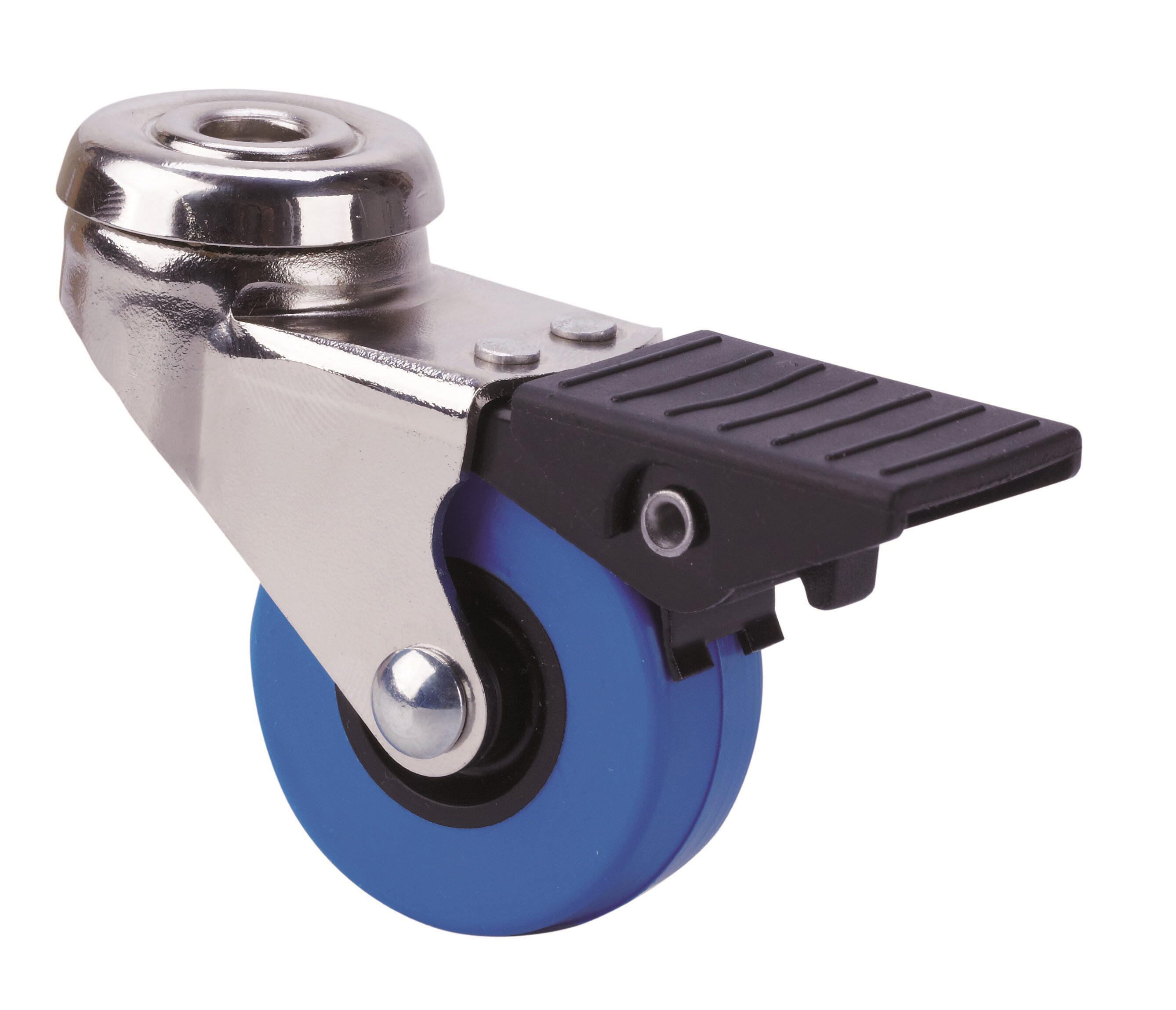 Sistema de fjación agujero pasante. Con freno. Fabricada con chapa de acero embutida hasta 2 mm de espesor. Acabado niquelado brillante. Ruedas de goma